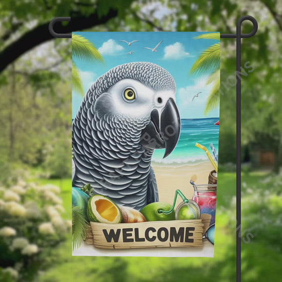 Add a splash of tropical charm to your garden with this 12"x18" flag featuring a lively African Grey parrot at the beach. Perfect for welcoming guests with a fun, colorful vibe, it’s a cheerful way to brighten up your outdoor space all year round. Durable and eye-catching, this flag brings personality and warmth to any garden or porch area. Image is on both sides. Flag stand is not included.