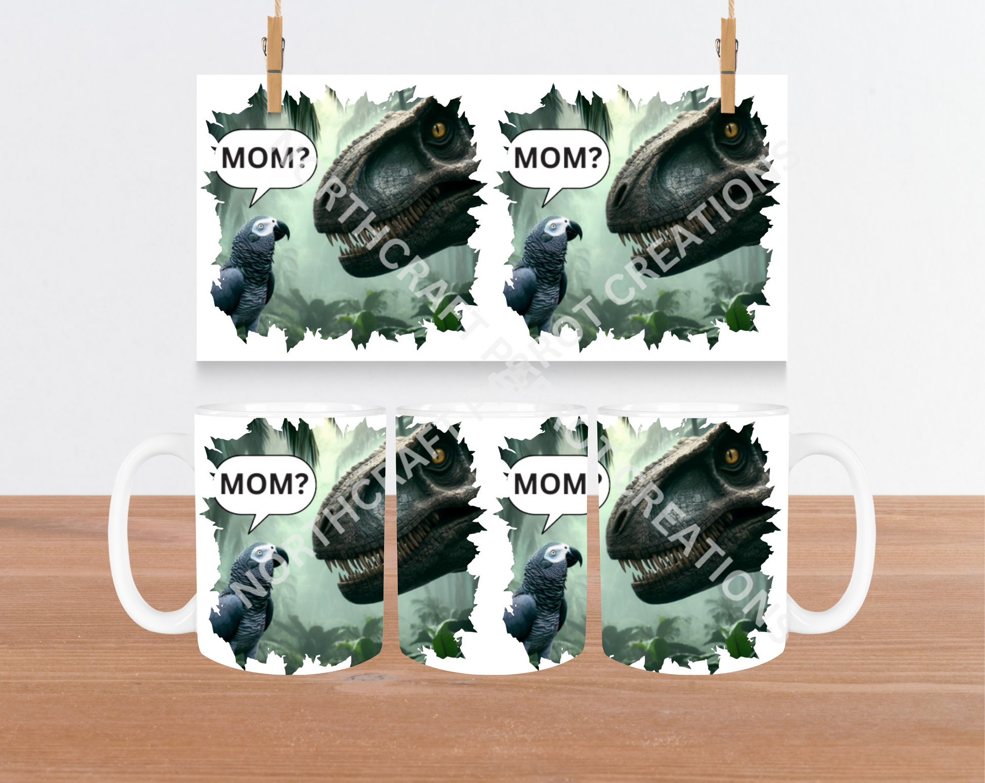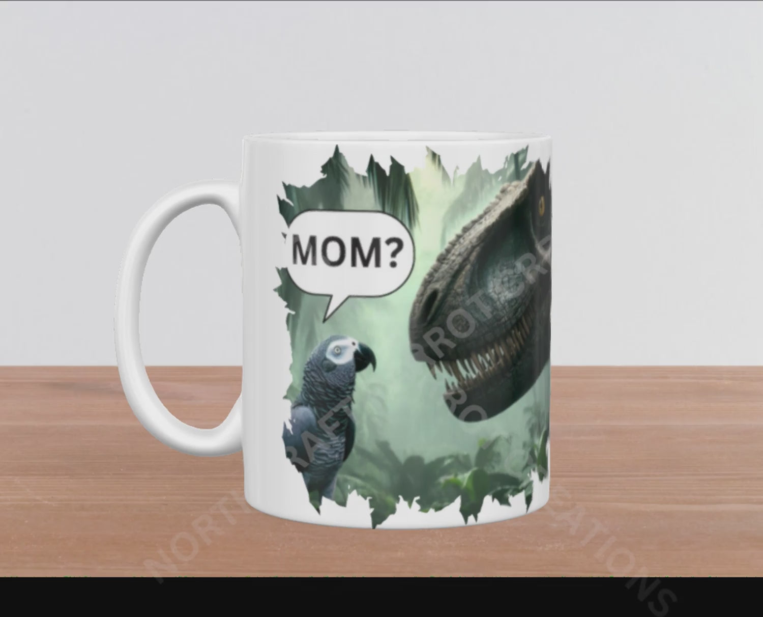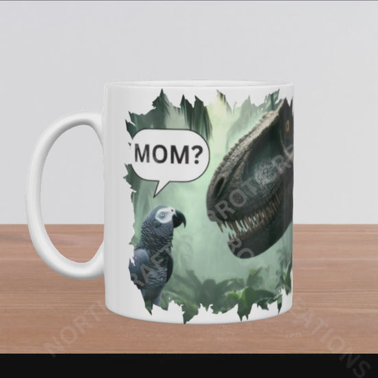 Start your day with a smile using this 15oz ceramic mug that shows an African Grey parrot gazing up at a Tyrannosaurus Rex and saying "Mom." It's a playful nod to the fun fact that birds are our modern-day little dinosaurs, making this mug a quirky and charming addition to your kitchen or a perfect gift for bird and dinosaur lovers alike.