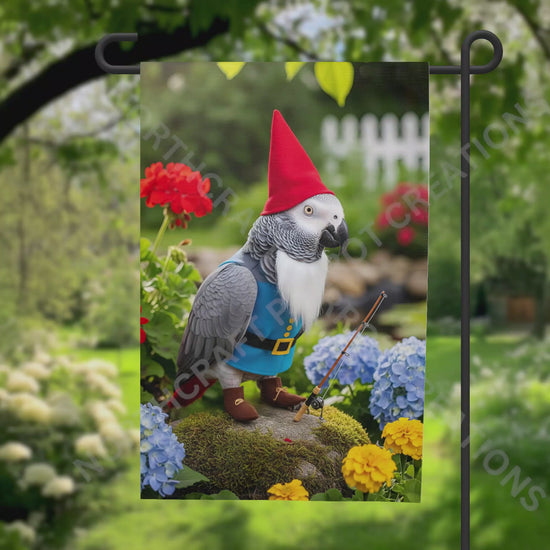 African Grey Dressed as Garden Gnome Among Flowers on a Rock Garden Flag