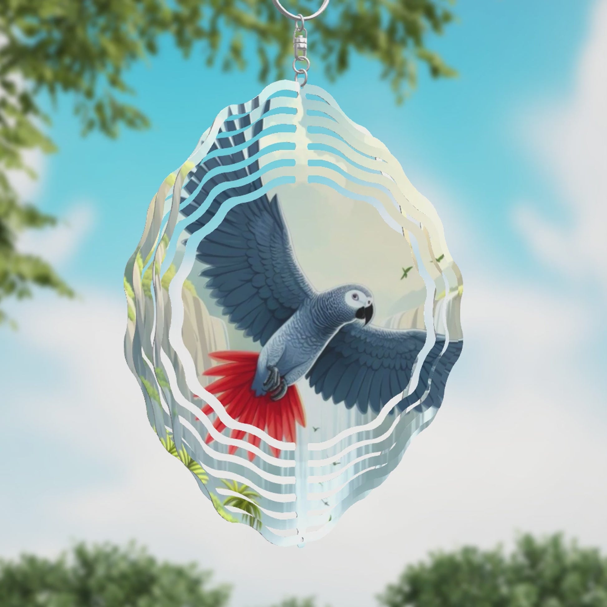Capture the serene beauty of an African Grey parrot in flight with this 8" or 10" wind spinner. Featuring its wings spread wide against a vibrant waterfall backdrop, this piece combines dynamic motion with vivid detail to enhance any outdoor space. Designed to catch the breeze, it brings graceful movement and a touch of nature-inspired artistry to your garden or patio. Durable and eye-catching, it offers an elegant way to celebrate the majesty of wildlife while adding visual interest to your surroundings.