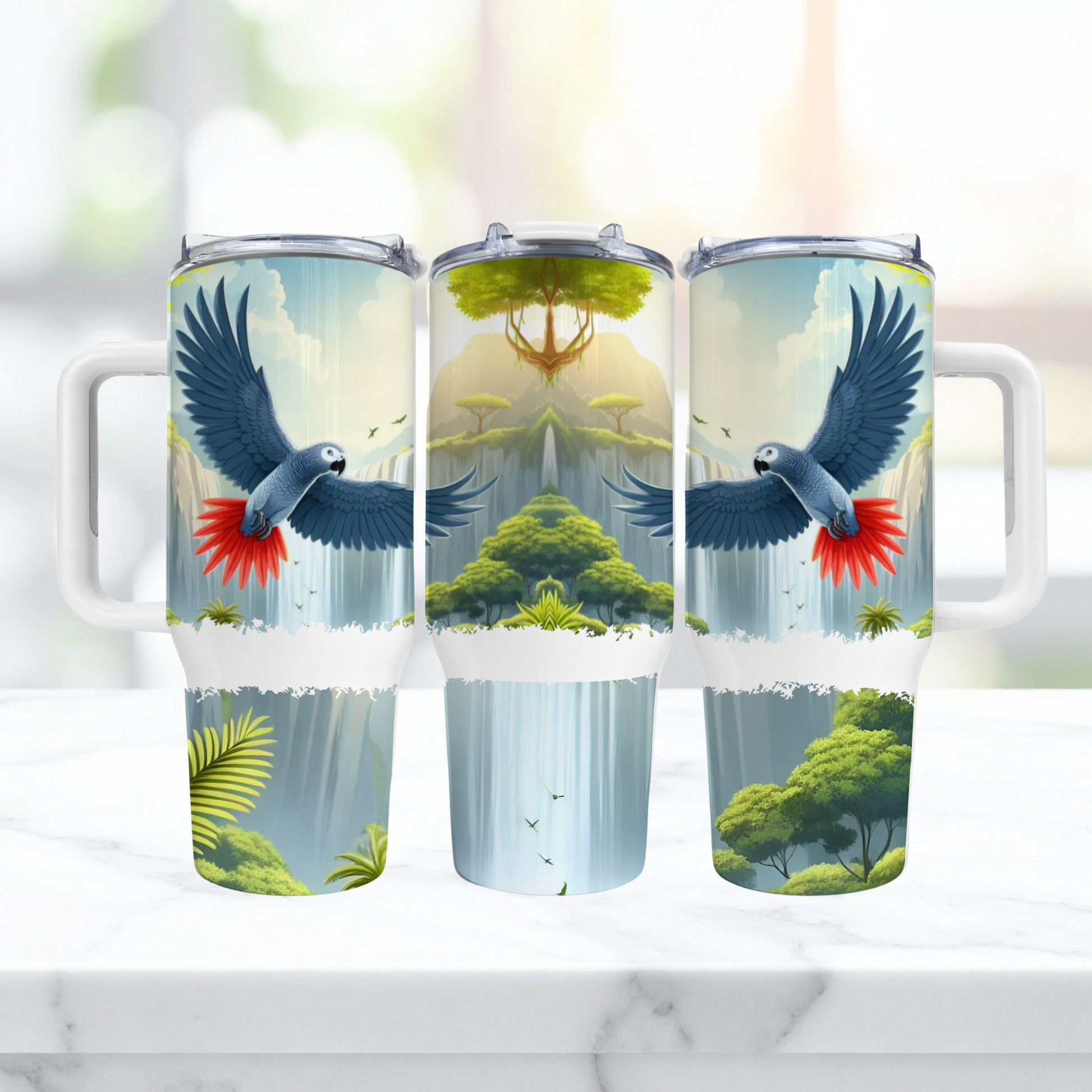 Take your favorite drink on an adventure with this African Grey 40oz Tumbler! Featuring a lively African Grey parrot soaring against a serene waterfall scene, this tumbler keeps drinks fresh and cool while adding a splash of nature’s beauty to your day. The sturdy handle makes it easy to carry on all your escapades, whether at home or on the go. Cheers to hydration with a wild twist!
