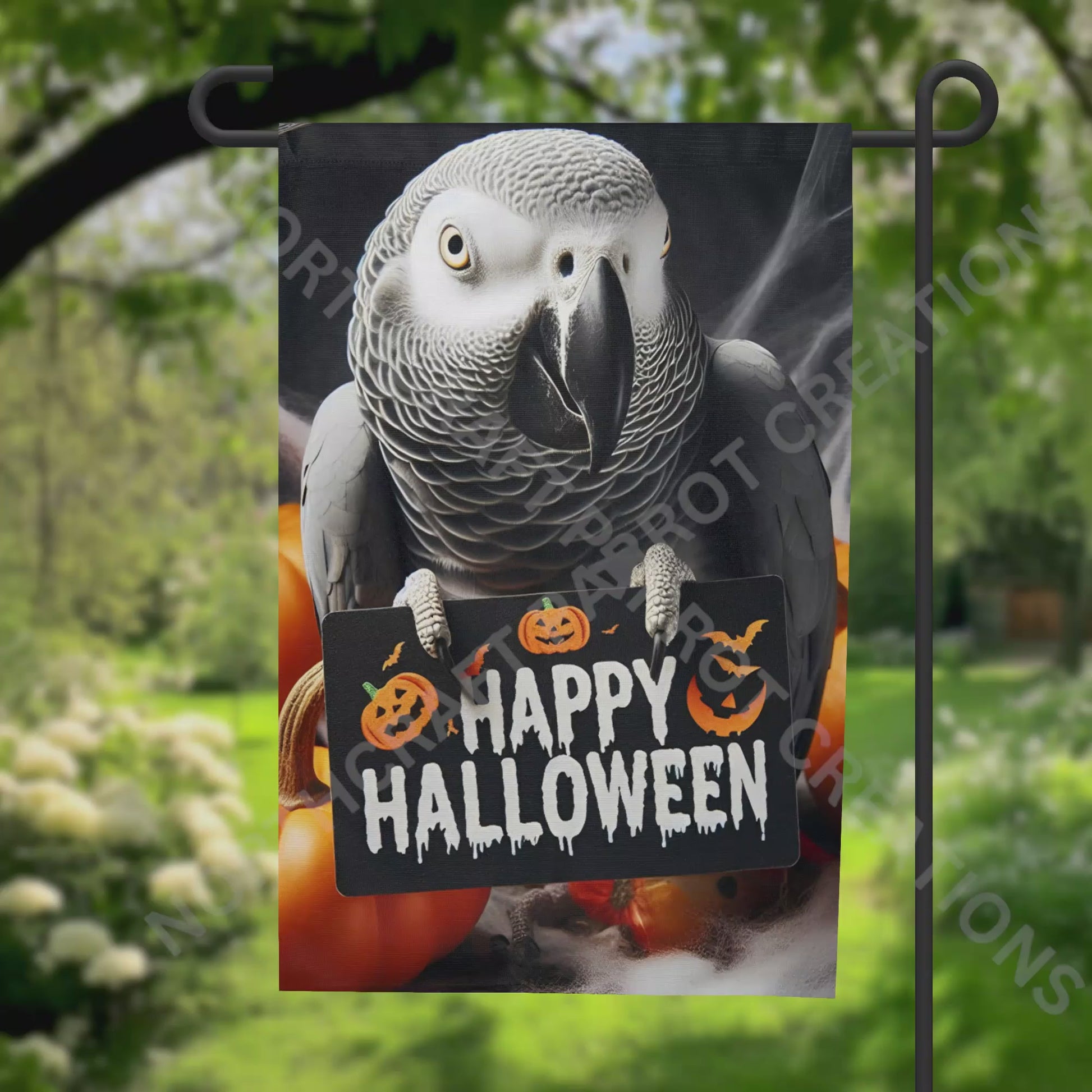 Celebrate Halloween with a playful twist featuring your favorite feathered friend! This garden flag showcases an African Grey alongside the festive phrase "Happy Halloween." Perfect for adding a touch of whimsy and seasonal cheer to your outdoor space, it brightens your garden while welcoming guests with feathered fun. It’s the perfect way to celebrate fall with a bird lover’s flair. Image is on both sides. Flag stand is not included.