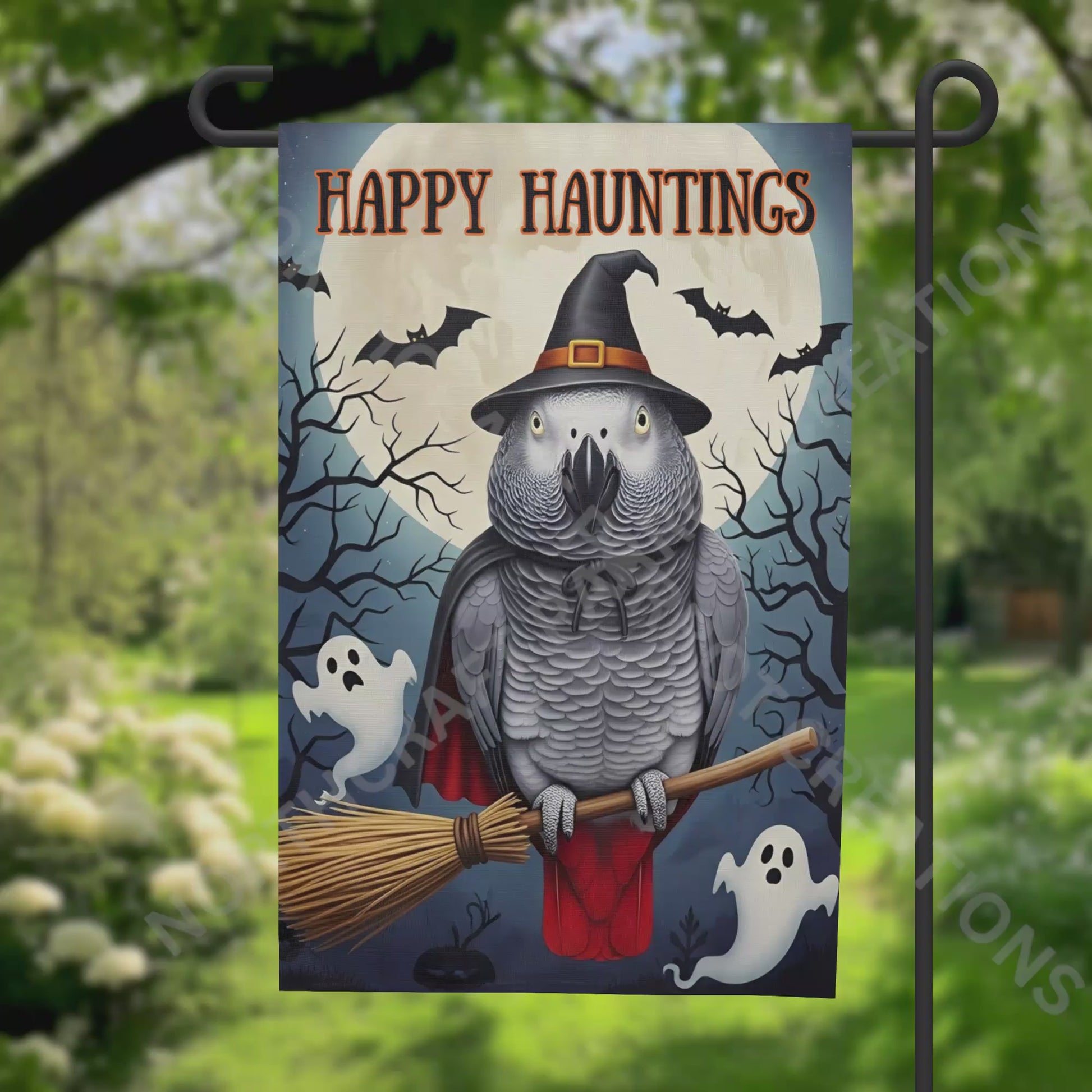 Celebrate Halloween with playful charm using this African Grey "Happy Hauntings" garden flag. Featuring a whimsical African Grey parrot donning a witch hat and riding a broom, it adds a festive touch to your outdoor decor. Perfect for welcoming guests with a fun, spooky spirit all season long.