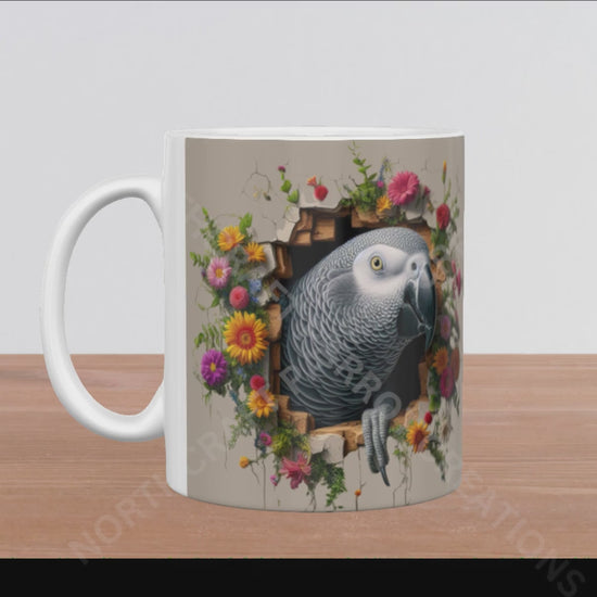 This 15oz ceramic mug features a captivating design of an African Grey parrot appearing to come through the surface, surrounded by beautiful flowers. Its sturdy construction makes it perfect for daily use, while the thoughtful artwork adds a special touch to your coffee or tea routine. Ideal for anyone who loves birds and nature, this mug brings warmth and charm to every sip.