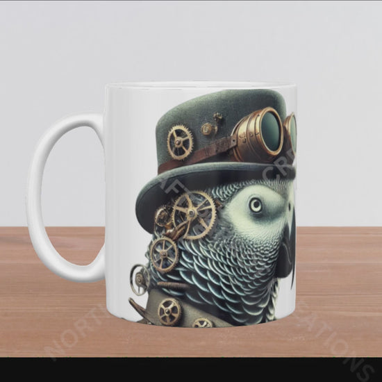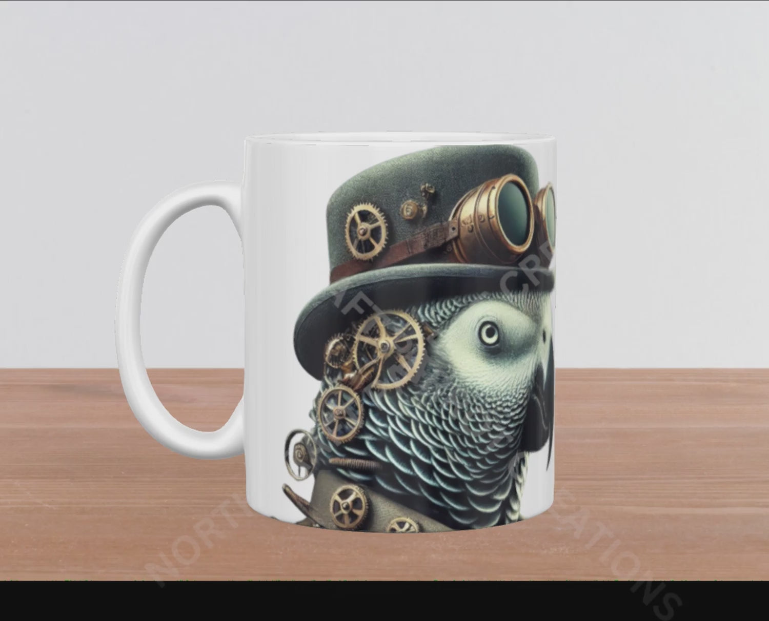 This 15oz ceramic mug showcases a striking African Grey parrot styled in a refined steampunk theme, complete with a detailed steampunk hat. Crafted for durability and comfort, it brings a unique blend of classic charm and imaginative design to your everyday coffee or tea ritual. Ideal for those who appreciate sophisticated artistry with a distinctive edge.