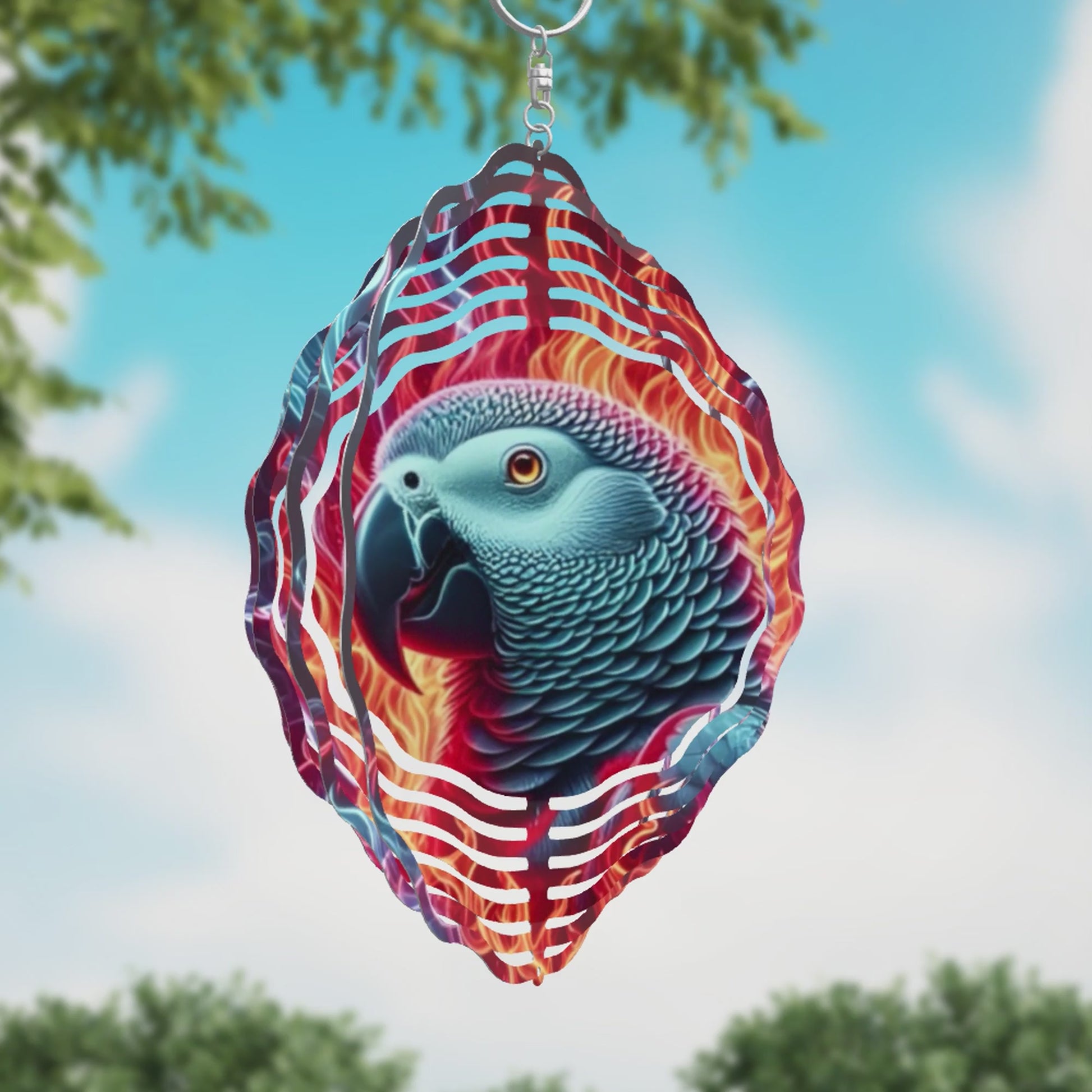 Bring some fiery flair to your garden with this African Grey in Flames wind spinner. Crafted from durable aluminum and available in 8" or 10" sizes, it features a striking grey parrot surrounded by vibrant orange, red, and blue flames. Watch it whirl and catch the breeze while adding a splash of bold color and a wink of wild personality to your outdoor space. Perfect for bird lovers who like a bit of heat in their décor!