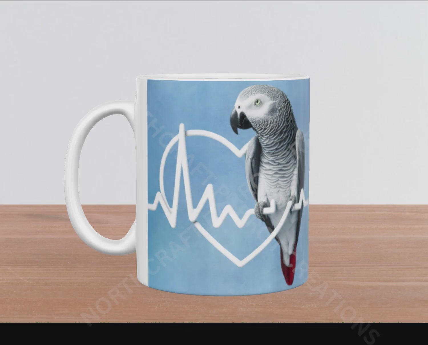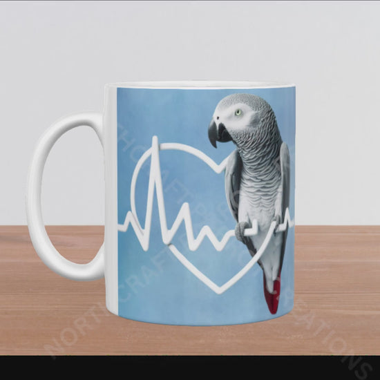 This 15oz ceramic mug features a sophisticated design of an African Grey parrot elegantly integrated into a heartbeat line set against a calming blue background. Perfect for showcasing your love for these intelligent birds, the mug combines striking visuals with practical size, making it an ideal choice for enjoying your favorite warm beverages with a refined touch.