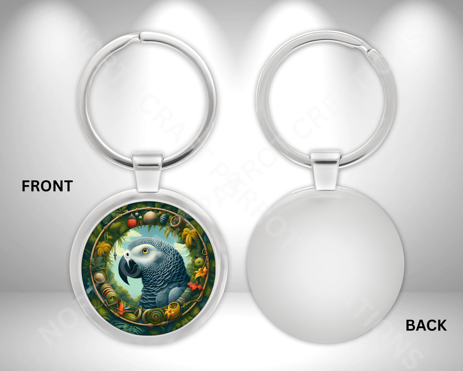 This sophisticated metal keychain features a beautifully crafted African Grey parrot set against a richly detailed rainforest backdrop within a circular frame. Designed for durability and elegance, it makes a subtle yet distinctive accessory that celebrates natural beauty with refined artistry, ideal for those who appreciate nature-inspired style.