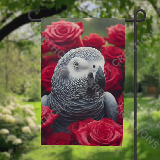 Add a splash of charm to your garden with this playful 12"x18" flag featuring an African Grey amid blooming roses. Perfect for bird lovers and garden enthusiasts, it brings a pop of color and personality to your outdoor space all year round. Durable and vibrant, it’s sure to make your garden the talk of the neighborhood! Image is on both sides. Flag stand is not included.