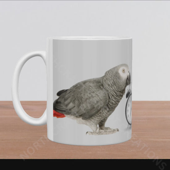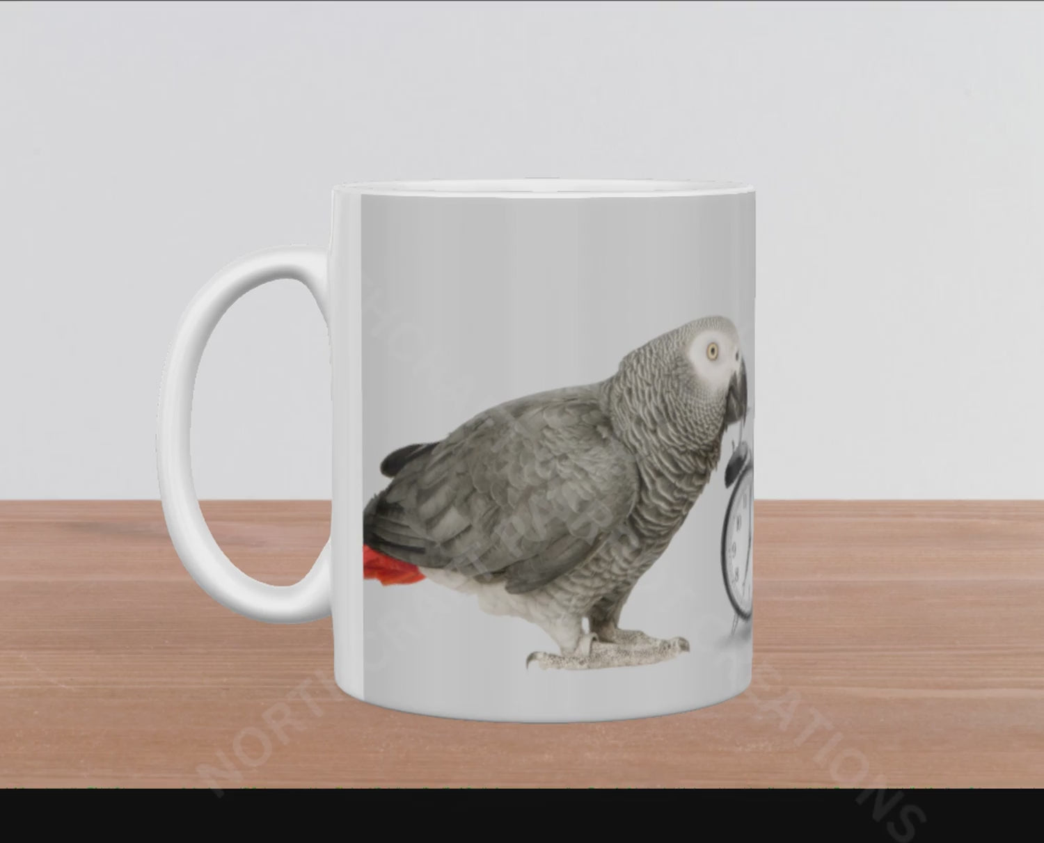 African Grey "My Alarm Clock Has Feathers and a Red Butt" 15oz Ceramic Mug