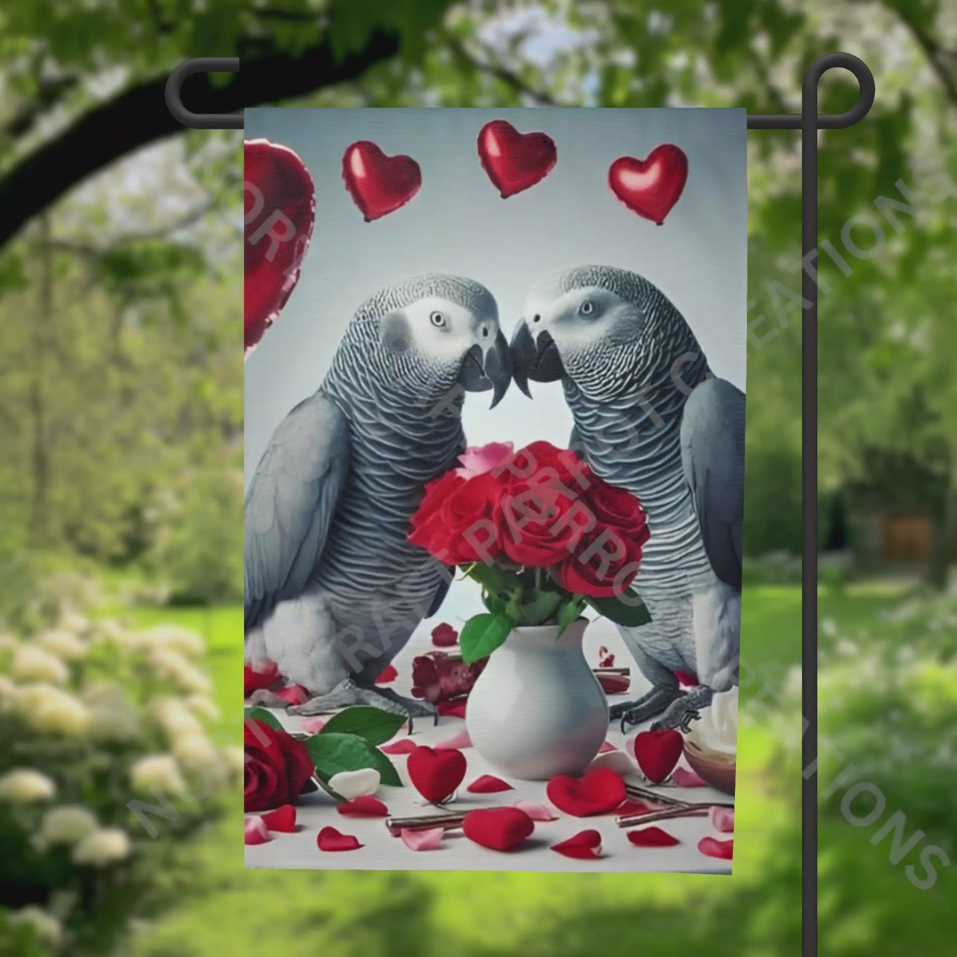 Brighten your garden with this beautiful flag featuring a charming pair of African Grey parrots surrounded by rose petals and balloons. A wonderful way to add a whimsical touch to your outdoor space, this vibrant design invites smiles and lighthearted fun in any weather. Perfect for year-round or Valentine's Day. Image is on both sides. Flag stand is not included.