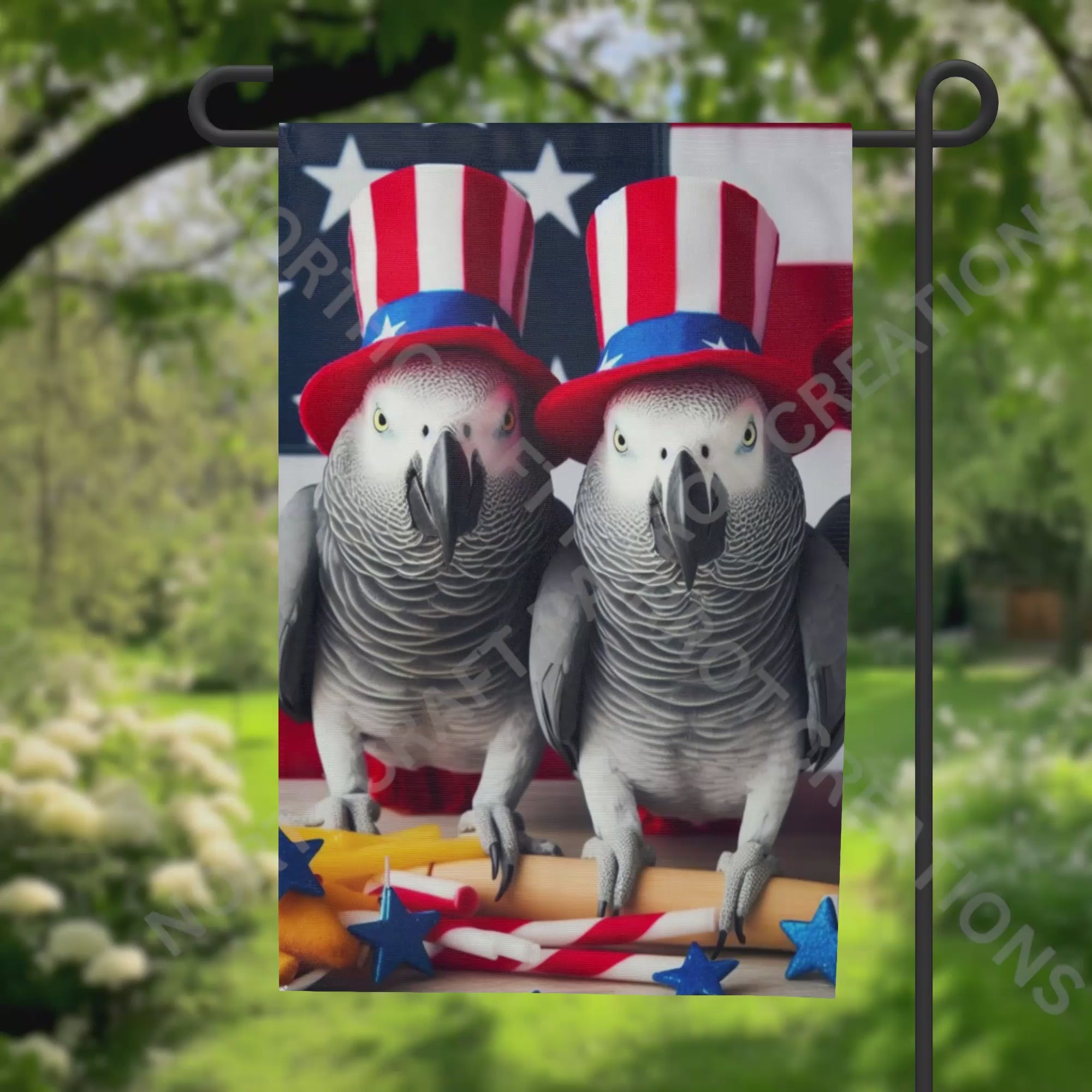 Celebrate patriotism with this garden flag, featuring a pair of African Grey parrots adorned in red, white, and blue hats. This refined design adds a tasteful, patriotic accent to your garden or outdoor space, combining the beauty of these intelligent birds with subtle national pride. It’s a sophisticated way to honor both nature and country. Image is on both sides. Flag stand is not included.