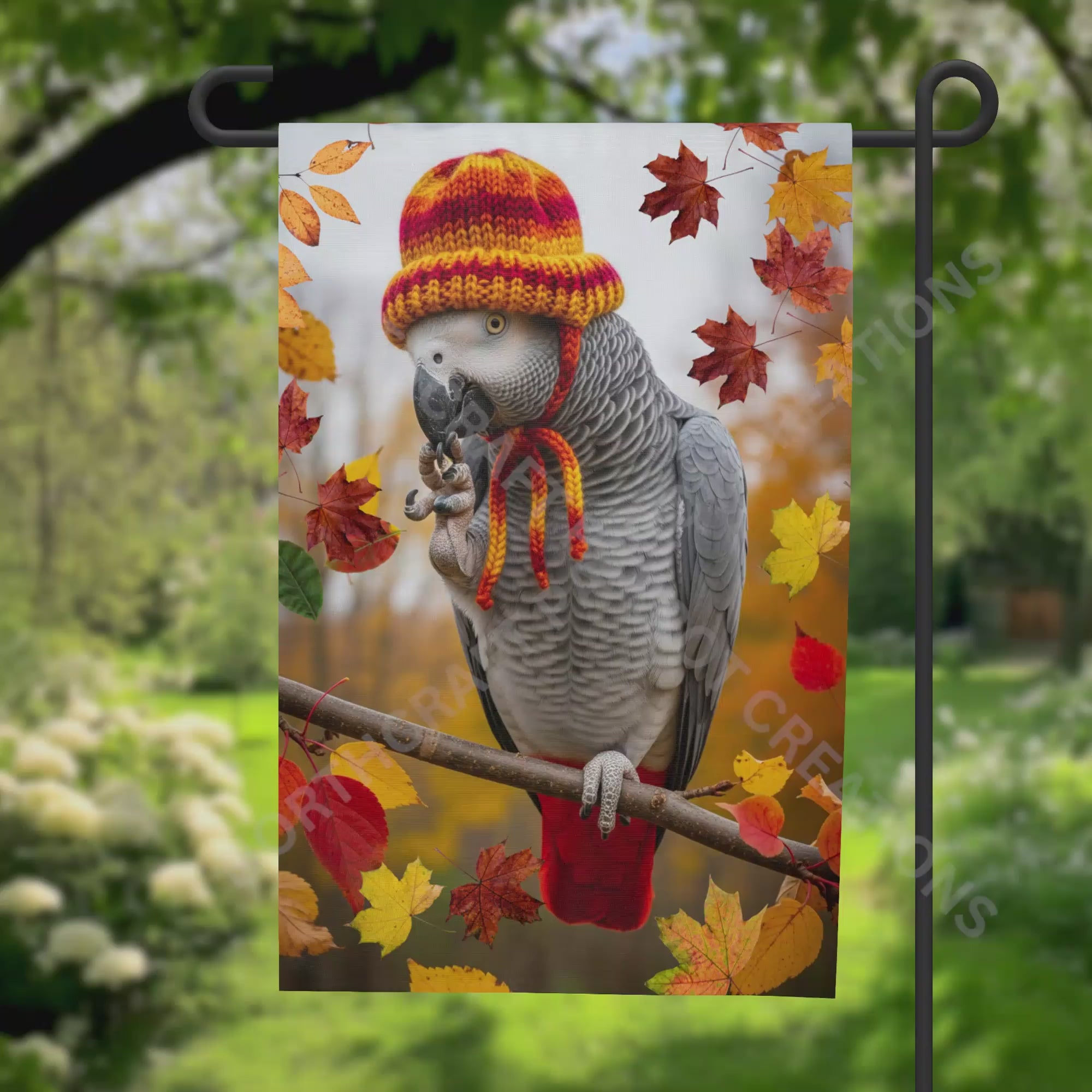 Celebrate the beauty of fall with this African Grey garden flag. Featuring a detailed African Grey parrot wearing a charming striped hat, perched gracefully on a branch surrounded by vibrant autumn leaves, this flag brings seasonal warmth and elegance to your outdoor space. Crafted for durability and vivid color retention, it’s ideal for enhancing garden areas with a touch of sophisticated birdwatching flair.