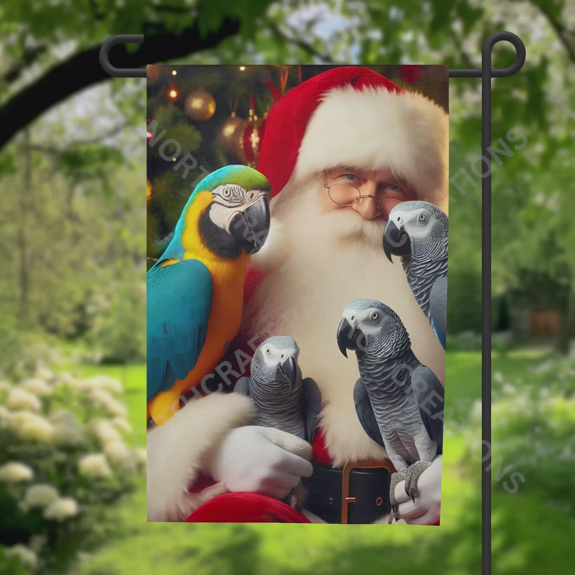 African Grey Trio and Blue & Gold Macaw with Santa Christmas Garden Flag