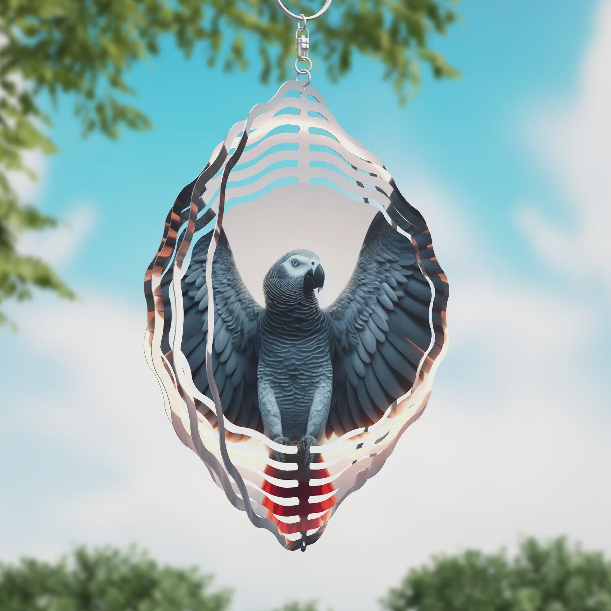 Capture the elegance of the African Grey parrot with this meticulously crafted wind spinner, available in 8" or 10" sizes. Featuring detailed artistry and vibrant colors, the spinner showcases the bird’s wings fully extended with its red tail, creating dynamic motion when caught by the breeze. Perfect for outdoor spaces, it offers a visually striking touch that celebrates the beauty and spirit of this intelligent species while adding graceful movement to your garden or patio.