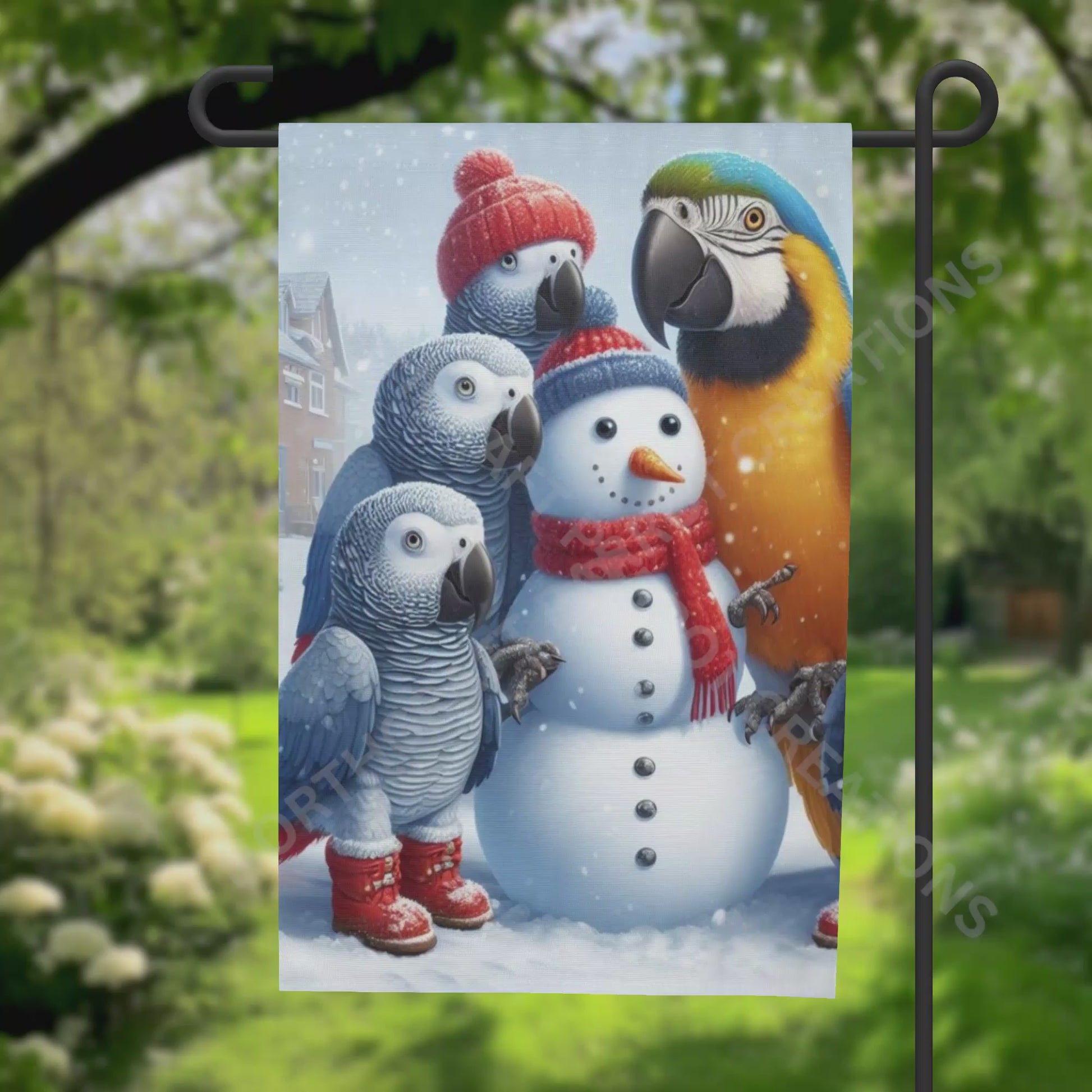 African Greys and Blue & Gold Macaw with a Snowman Garden Flag