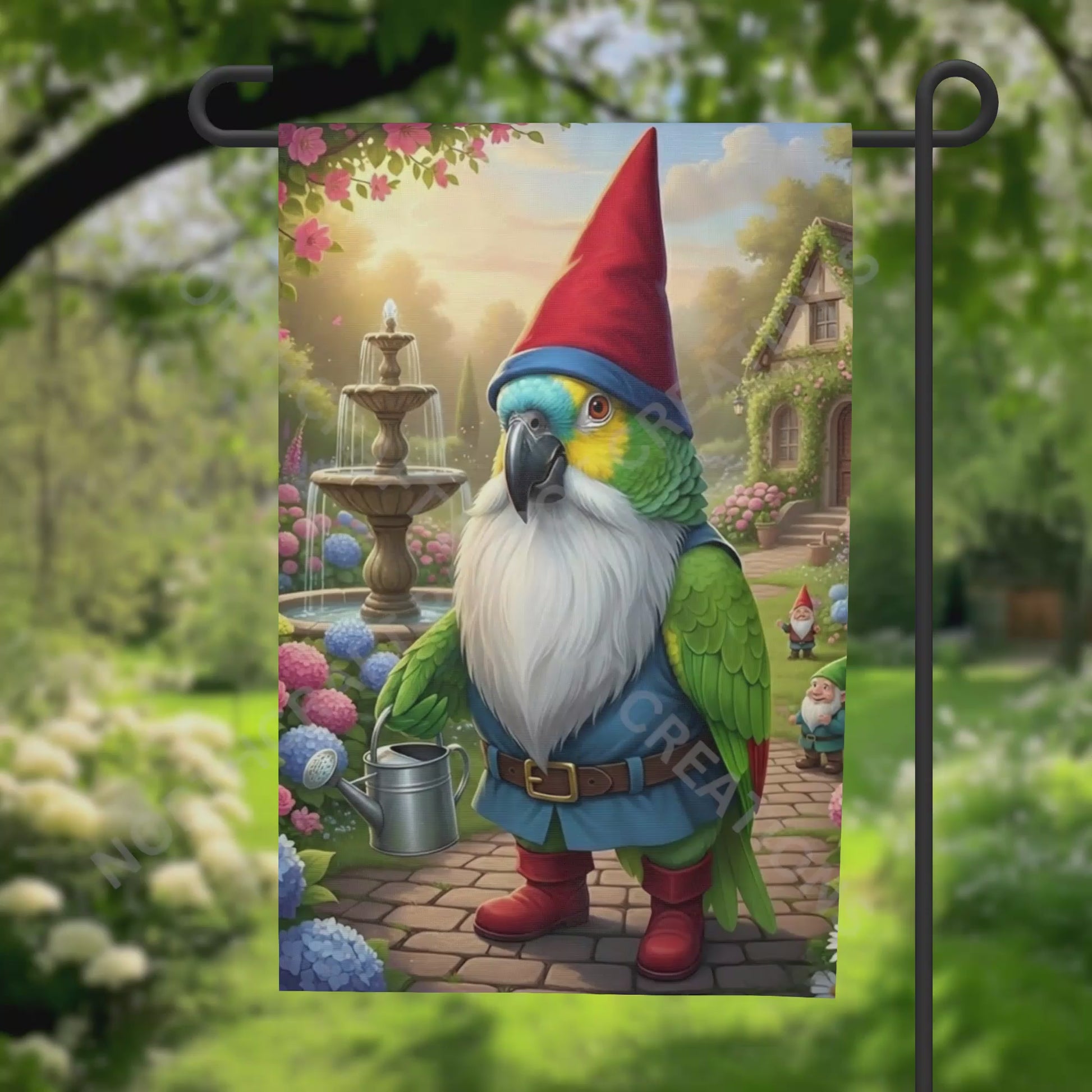 Bring whimsy to your garden with this delightful garden flag featuring a Blue-Fronted Amazon Parrot dressed as a charming garden gnome! Complete with a fuzzy beard, pointy hat, and full gnome outfit, this clever parrot clutches a watering can while relaxing beside a peaceful water fountain. Perfect for adding personality and humor to your outdoor space, this flag celebrates the quirky side of garden décor. A conversation starter that bird lovers and garden enthusiasts will adore!