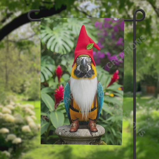 Brighten your garden with this cheerful flag showcasing a Blue and Gold Macaw standing proudly as a garden gnome. With a vibrant red hat and a fluffy white beard, this whimsical design brings joy and a touch of fun to your outdoor decor, making every day feel a little more magical.