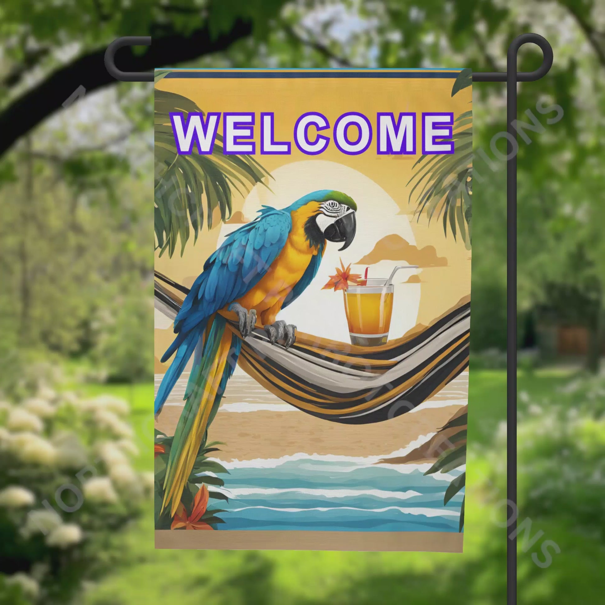 Elevate your garden’s charm with this Blue and Gold Macaw garden flag. Featuring a stunning macaw perched comfortably on a hammock, paired with a warm “Welcome” message, it adds a tropical touch to any outdoor space. Perfect for greeting guests with style and grace. Image is on both sides. Flag stand is not included.