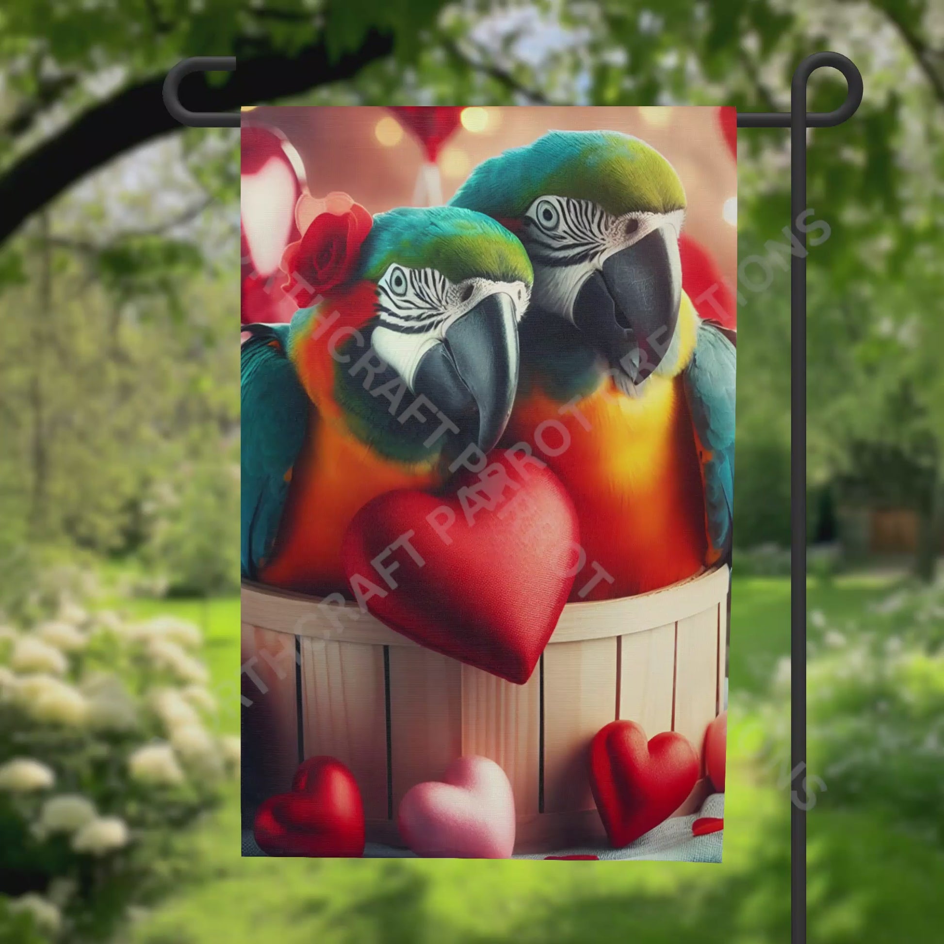 Celebrate your love for birds with this playful garden flag featuring a charming pair of Blue and Gold Macaws nestled in a basket surrounded by hearts. Perfect for brightening your outdoor space, this flag adds a cheerful splash of color and whimsy that bird lovers and garden enthusiasts will adore. Its eye-catching design brings warmth and fun to any garden, patio, or yard. Perfect for year-round or Valentine's. Image is on both sides. Flag stand is not included.