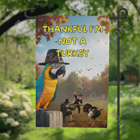 Celebrate Thanksgiving with a playful twist featuring a vibrant Blue and Gold Macaw on your garden flag. This charming design shows Pilgrims hunting a turkey—while the cheeky macaw watches with the words "Thankful I'm Not a Turkey"! Perfect for adding colorful fun and festive spirit to your outdoor decor this holiday season.