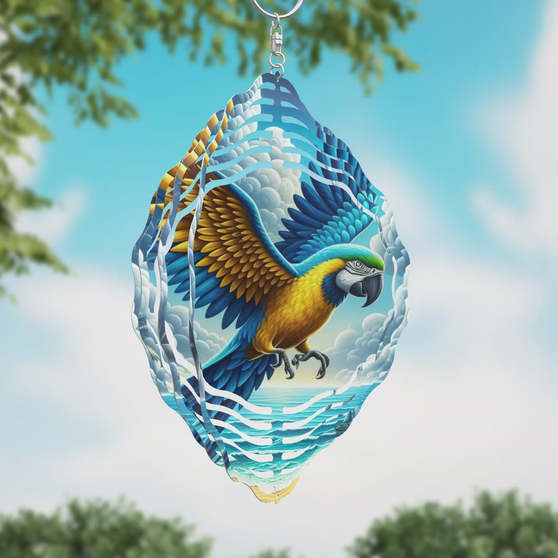 Celebrate vibrant tropical beauty with this Blue and Gold Macaw wind spinner. Crafted from durable aluminum, it features a stunning macaw in flight against a serene ocean backdrop. Available in 8" or 10" sizes, its colorful wings gracefully spin with the breeze, adding dynamic charm to any outdoor space. Perfect for bringing a lively tropical atmosphere to your garden or patio.