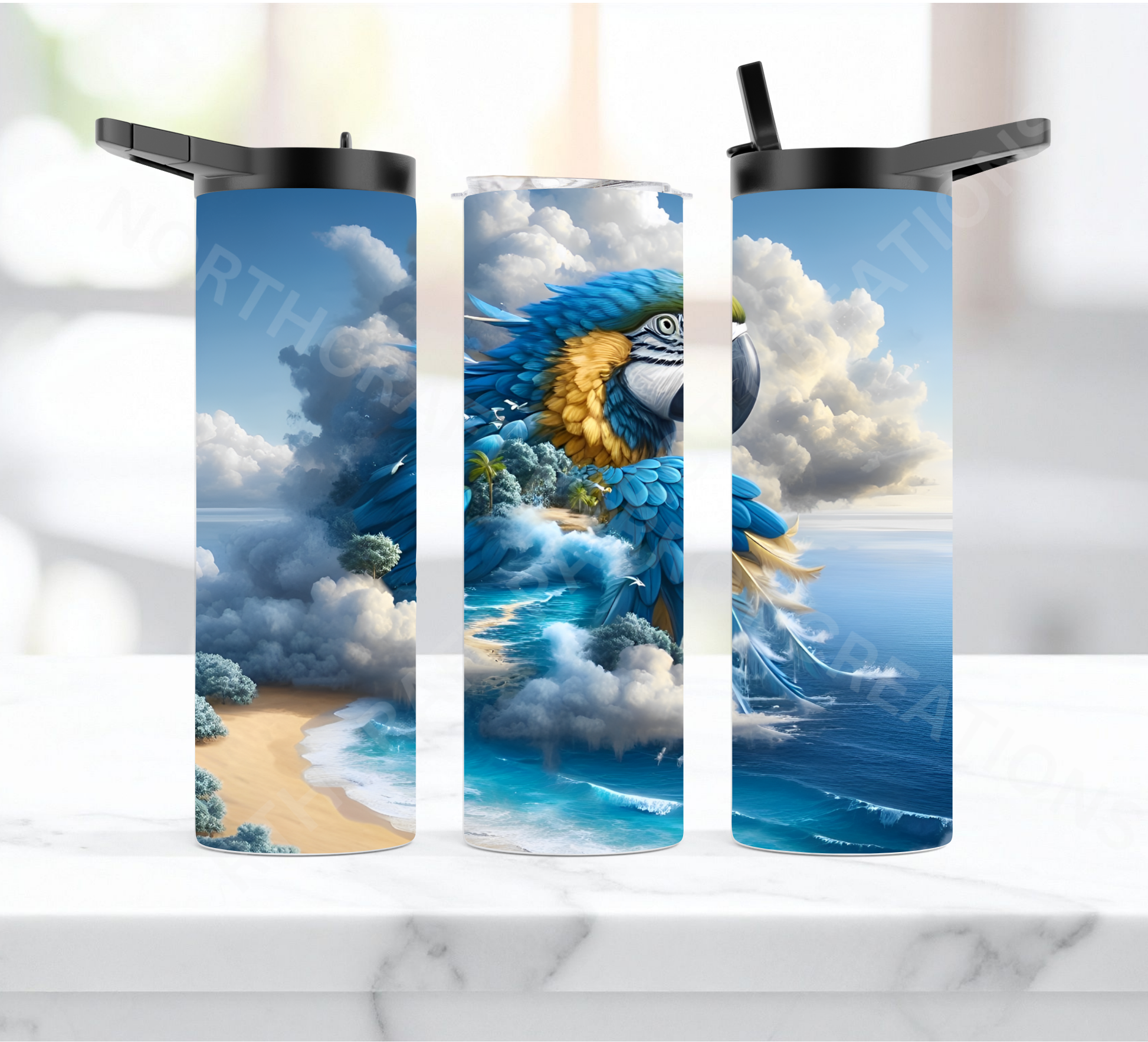 This insulated stainless steel tumbler showcases a sophisticated design of a Blue & Gold Macaw appearing to emerge gracefully from the ocean and clouds. Combining striking artistry with durable double-wall insulation, it keeps your drinks at the perfect temperature while making an elegant statement wherever you go.