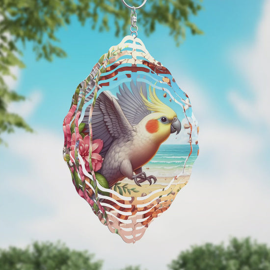 Energize your garden or patio with this vibrant Cockatiel wind spinner. Featuring a lively grey and yellow Cockatiel bursting through a wall against a bright beach backdrop, this 8" or 10" spinner adds playful motion and color to any outdoor space. Perfect for bird lovers looking to bring energy and charm to their décor while catching the breeze beautifully.
