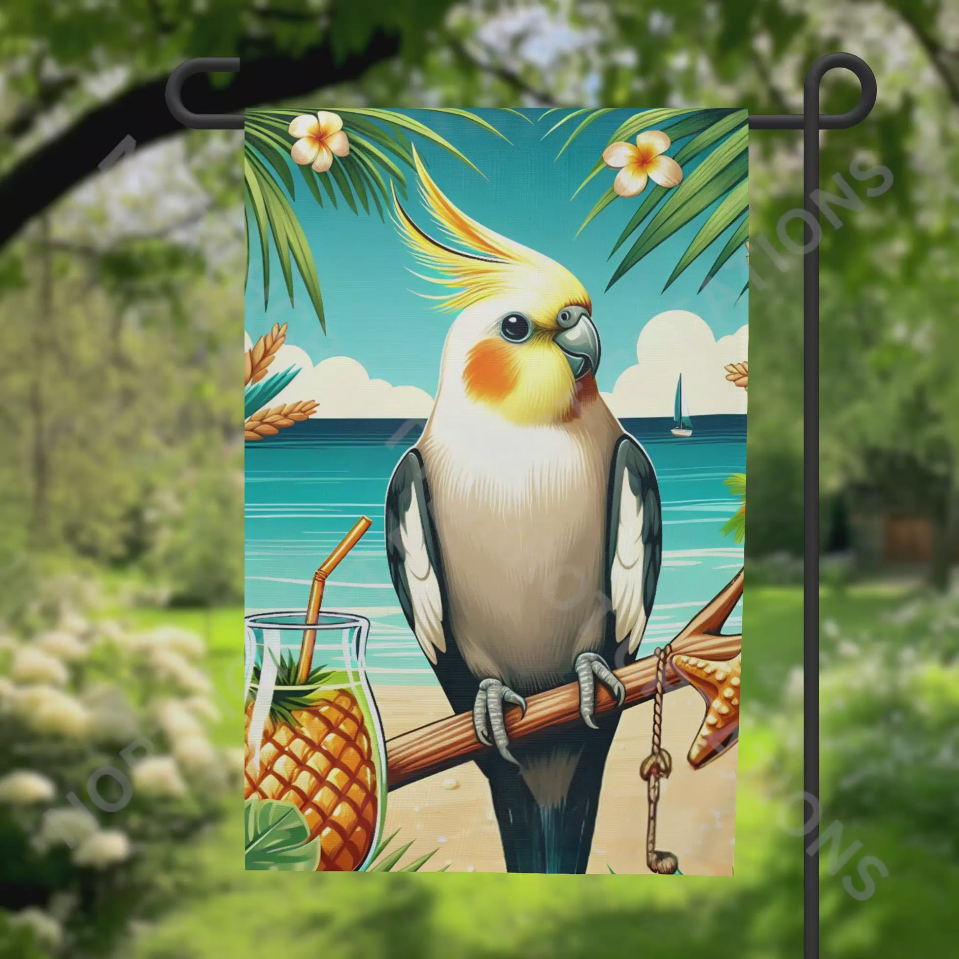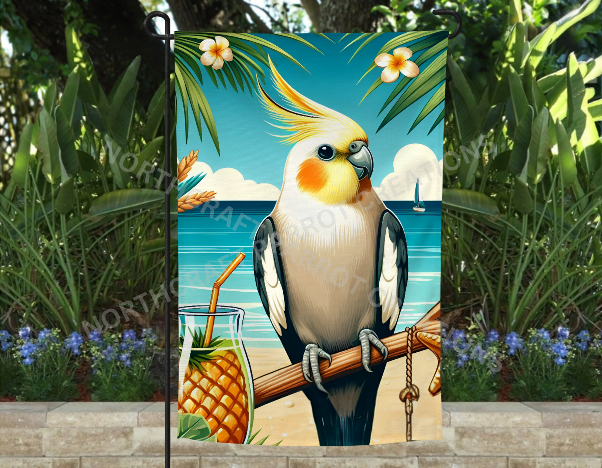 This garden flag showcases a charming Cockatiel perched on a branch against a serene beach backdrop, complemented by a pineapple drink. It adds a touch of tropical elegance and avian beauty to any garden or patio space. Ideal for bird lovers seeking a distinctive, weather-resistant accent to enhance their outdoor décor. Image is on both sides. Flag stand is not included.