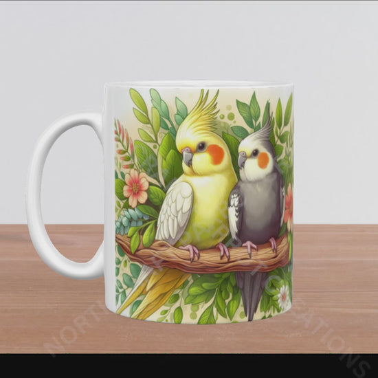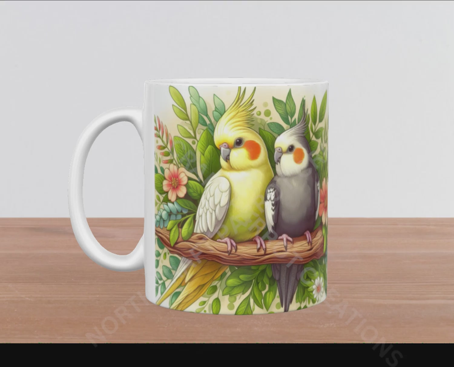 Enjoy your favorite beverage with this charming 15oz ceramic mug featuring a delightful pair of Cockatiels perched gracefully on a branch, surrounded by vibrant flowers and lush green leaves. The vivid design brings a touch of nature’s beauty to your daily routine, making each sip feel like a peaceful moment in a garden. Perfect for bird lovers and anyone who appreciates serene, artistic details in their drinkware.