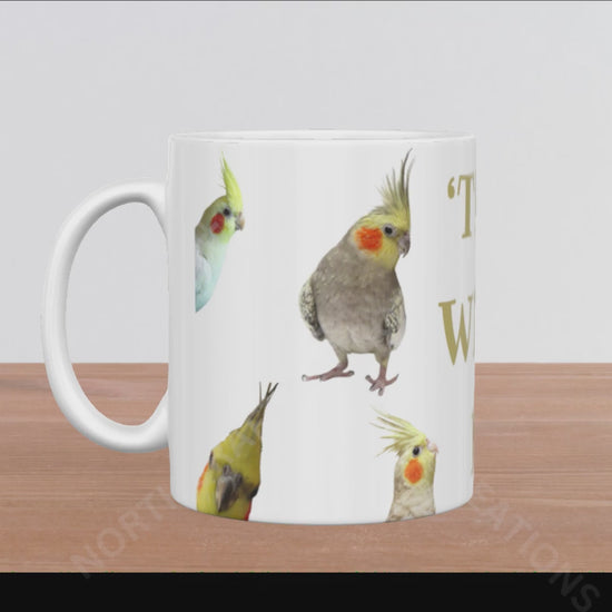 Celebrate your love for cockatiels with this playful 15oz ceramic mug featuring a colorful variety of cockatiels against a clean white background. The cheeky phrase "Tiel With It" adds a fun touch, making every sip a delightful experience. Perfect for bird lovers who enjoy a lighthearted start to their day.