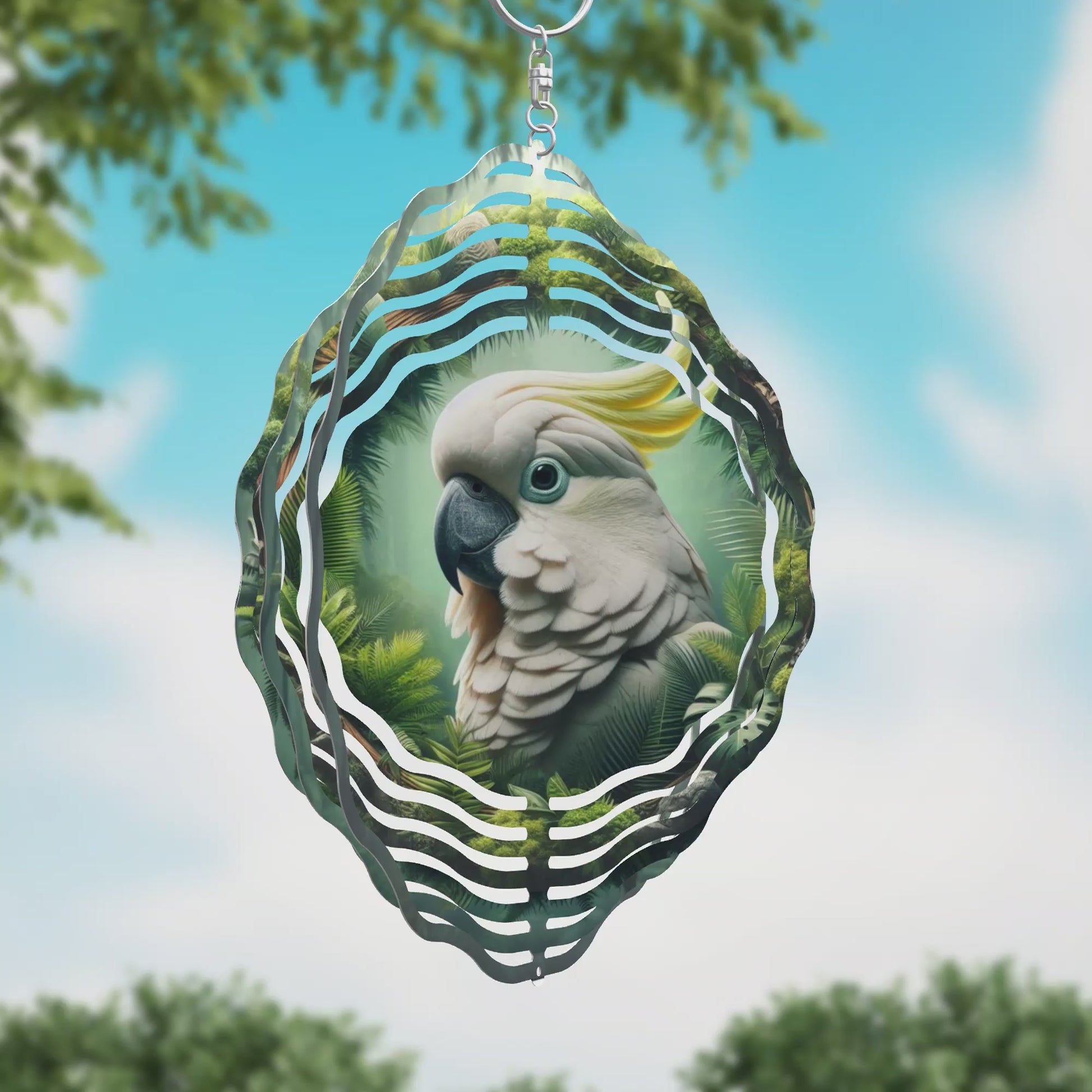Experience the serene elegance of a cockatoo gracefully perched amid a lush tropical scene, beautifully captured on this wind spinner. With its feathers fluffed up around its lower beak showing contentment and happiness. Expertly crafted to enhance outdoor spaces, it adds a touch of tranquil sophistication while gently moving with the breeze, creating a calming ambiance for any garden or patio.