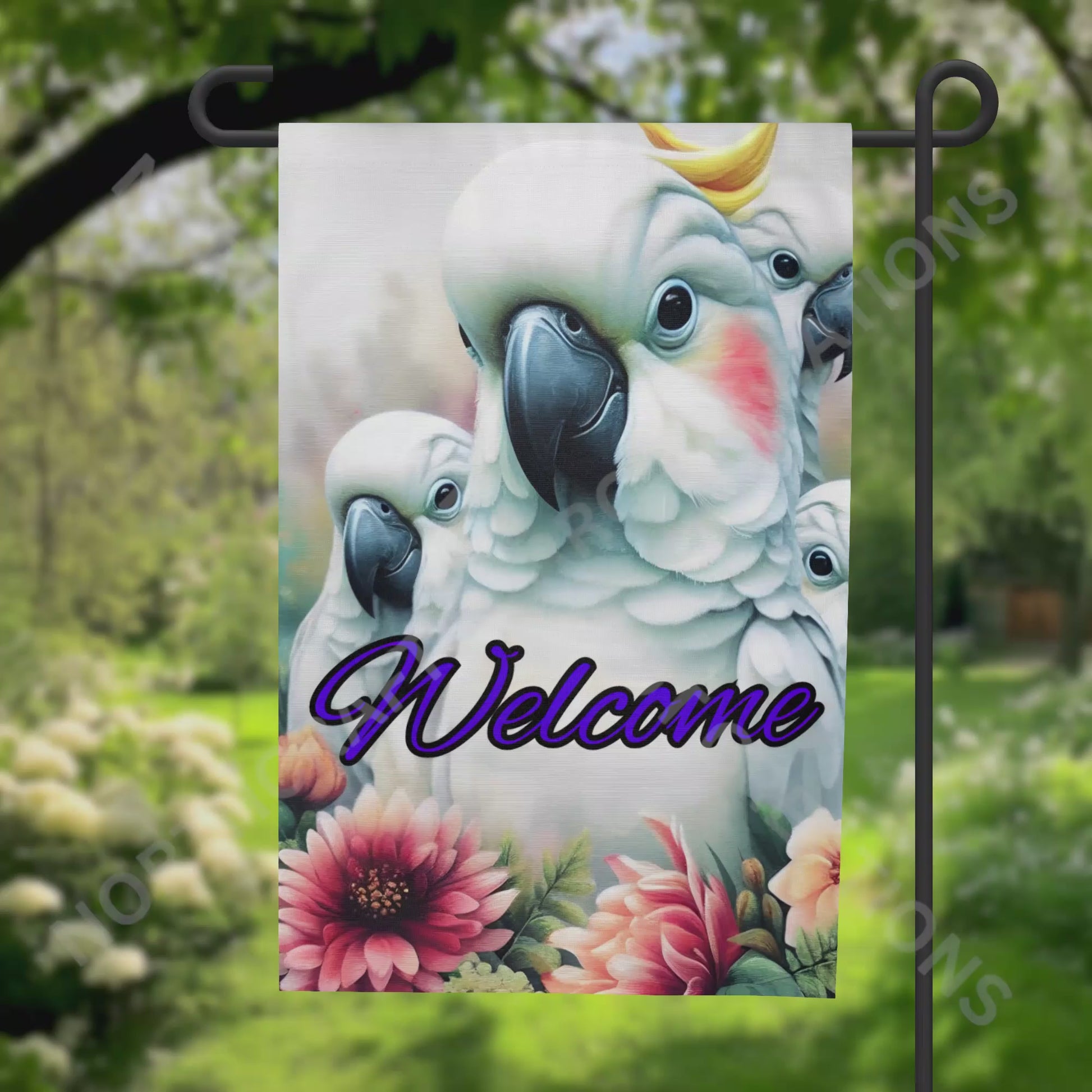 Elevate your outdoor décor with "Welcome" garden flag. Featuring an elegant Cockatoo surrounded by delicate floral accents, this flag warmly greets guests while adding refined charm to your garden or porch. It effortlessly blends nature-inspired beauty with a gracious welcome. Image is on both sides. Flag stand is not included.