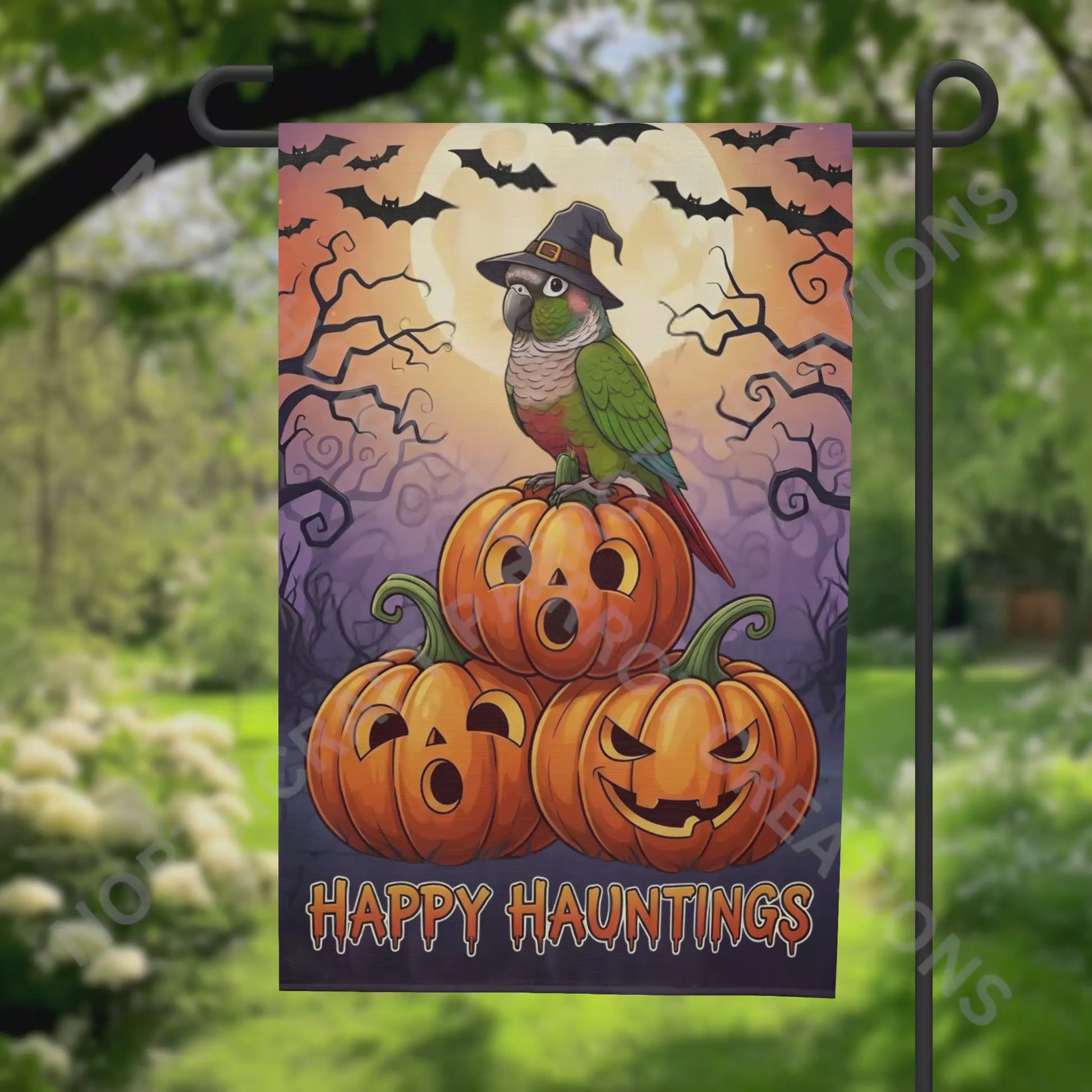 Celebrate Halloween with a playful twist featuring a vibrant Conure surrounded by pumpkins and bats on this microfiber waffler weave garden flag. Bright and durable, it brings festive charm to your garden while the cheerful "Happy Hauntings" greeting adds a spooky-yet-fun welcome for all your visitors. Perfect for adding a splash of color and personality to your autumn décor.