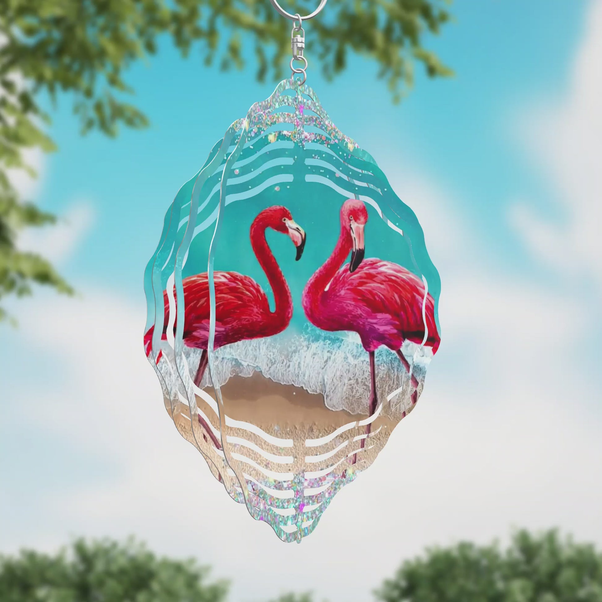 While they are not parrots, they still have feathers. Enjoy our Flamingo wind spinner, available in 8" and 10" sizes. Featuring two elegant flamingos against a beach backdrop. Designed to rotate smoothly in the breeze, it adds dynamic movement and a refined tropical touch to gardens, patios, or porches. Durable and weather-resistant, it combines aesthetic appeal with reliable outdoor performance.