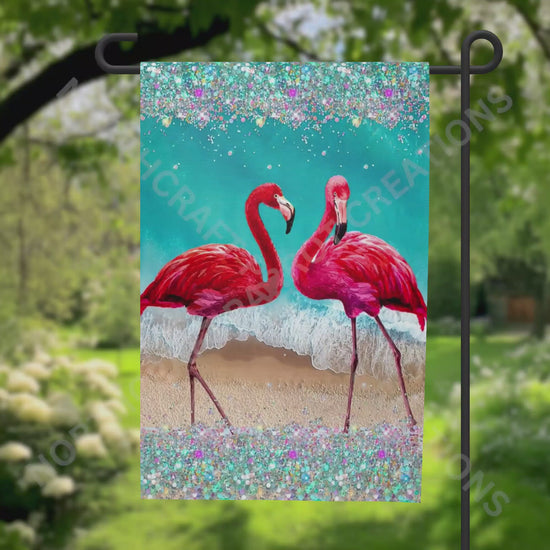 Enhance your outdoor space with this elegant Flamingo Pair on a Beach Garden Flag. Featuring two graceful flamingos set against a serene beach backdrop, this flag brings a touch of refined tropical charm to your garden. It offers a sophisticated accent that complements any outdoor décor. Perfect for adding subtle warmth and a distinctive style to your outdoor living area. Image is on both sides. Flag stand is not included.