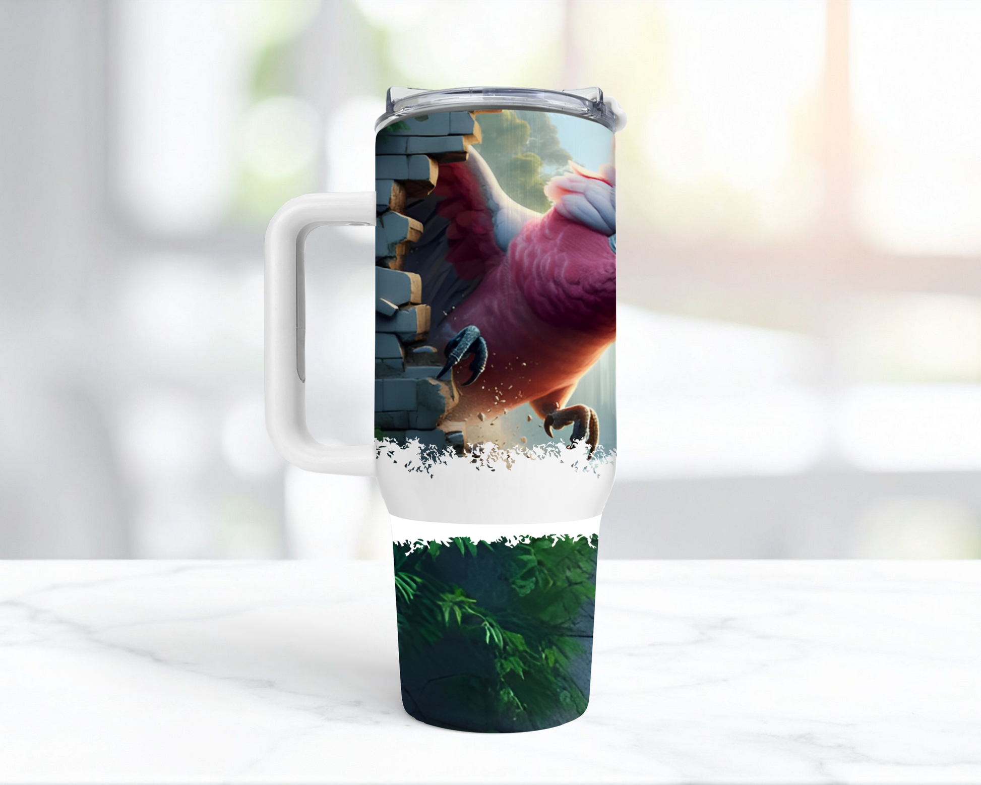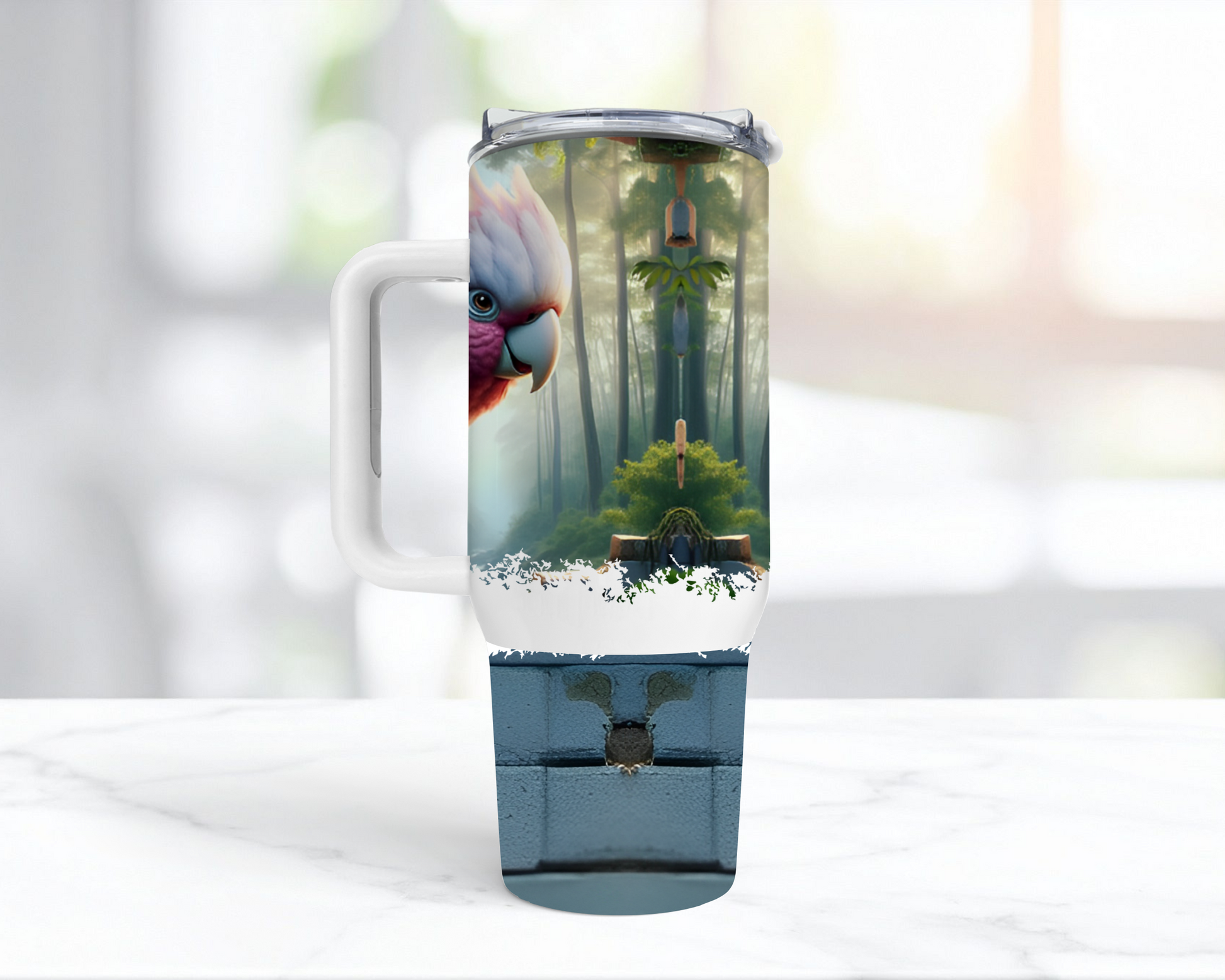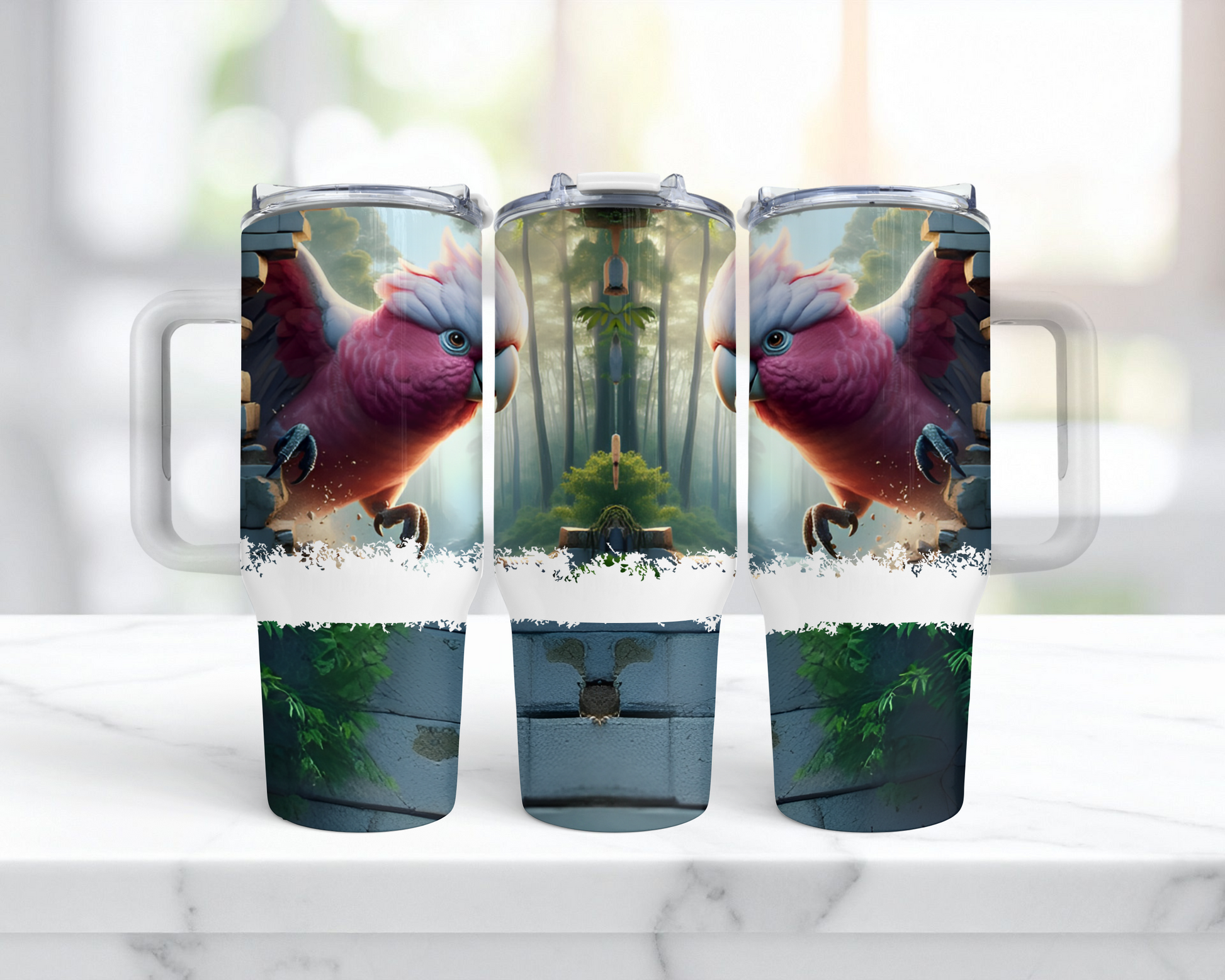 This 40oz stainless steel insulated tumbler features a stunning Galah Cockatoo (Rose-Breasted Cockatoo) breaking through a forest wall, combining striking wildlife imagery with practical functionality. Its double-wall insulation keeps beverages hot or cold for extended periods, making it ideal for outdoor enthusiasts and bird lovers alike. Durable and easy to clean, this tumbler offers both visual appeal and reliable performance for your daily hydration needs.