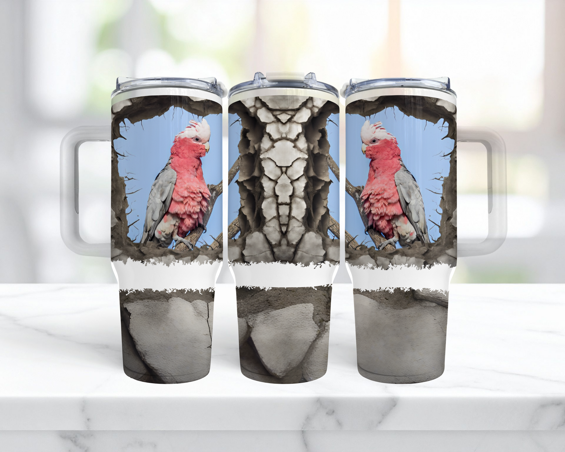Experience nature’s charm with a Galah Cockatoo (Rose Breasted Cockatoo) 40oz Tumbler. Featuring a vivid image of a Galah Cockatoo perched on a branch, viewed through a uniquely cracked wall frame design, this insulated stainless steel tumbler keeps drinks hot or cold for hours. Durable and stylish, it’s perfect for bird lovers who want to enjoy their favorite beverages while showcasing a touch of wild beauty wherever they go. Elevate your drinkware with this eye-catching, functional piece.