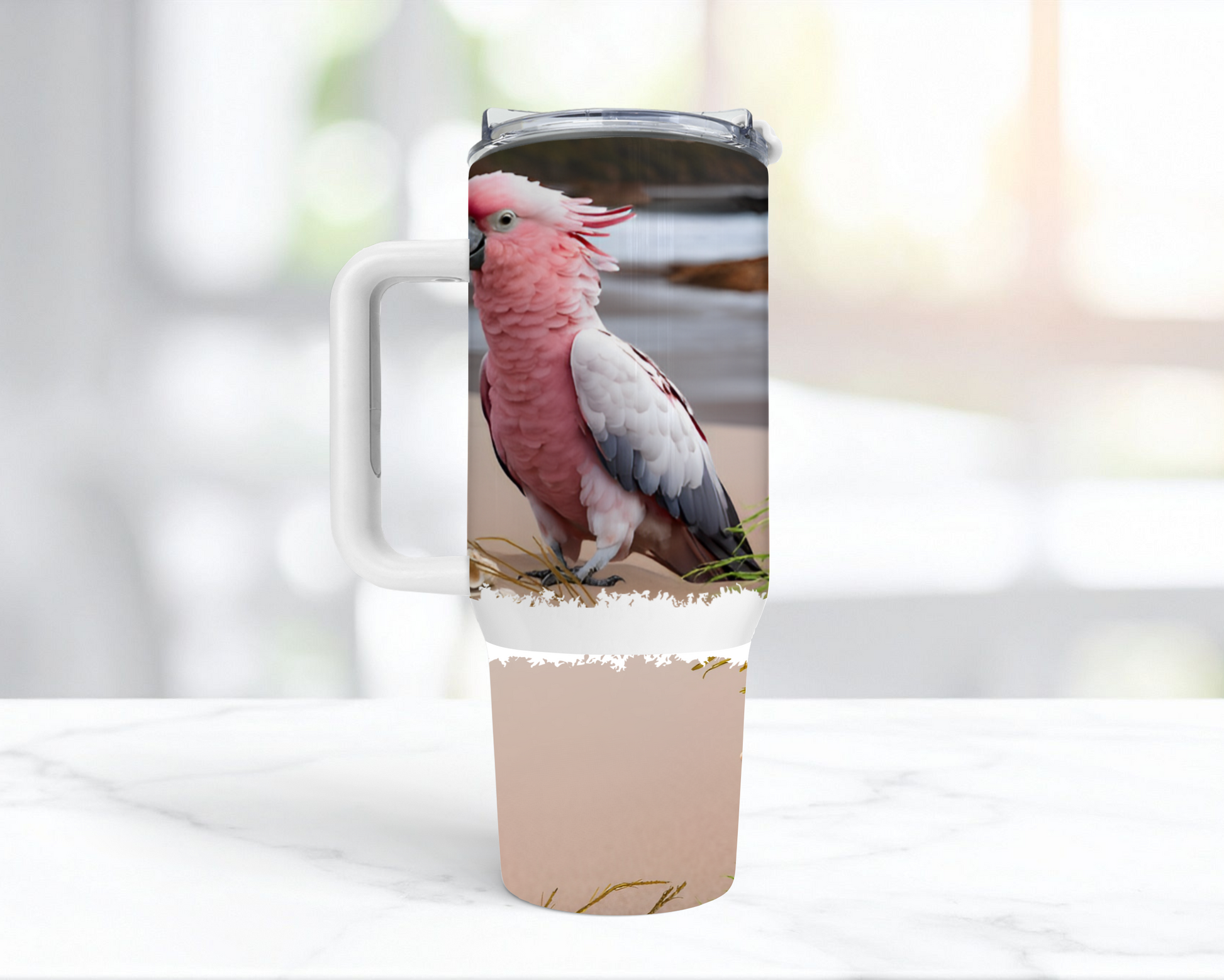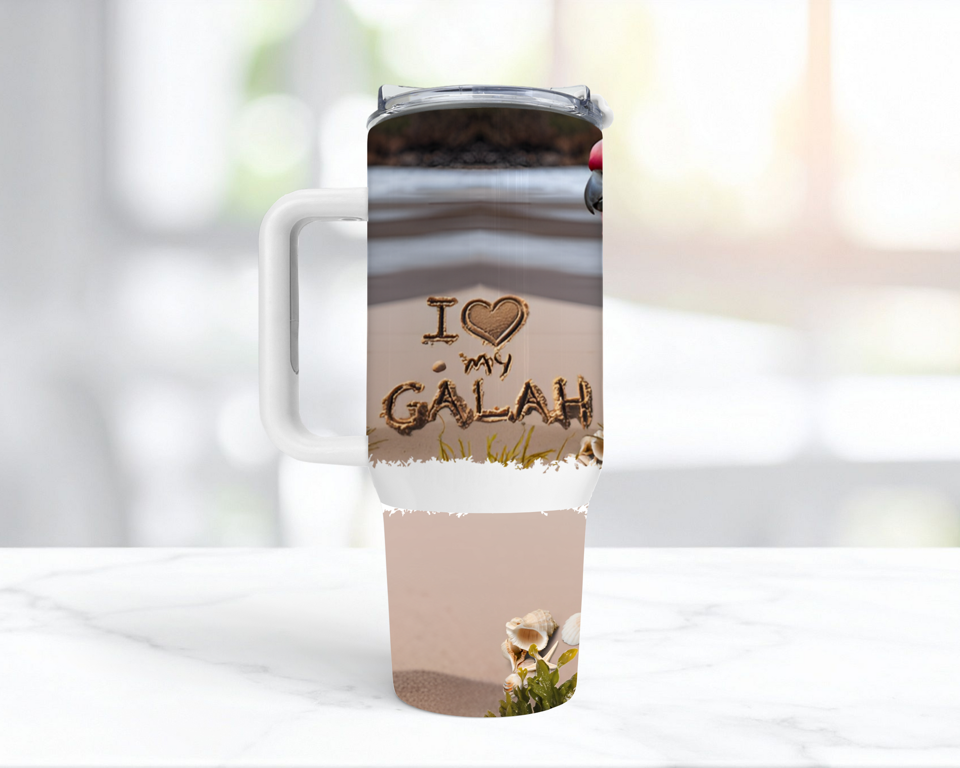 This 40oz stainless steel insulated tumbler features a detailed design of a Galah Cockatoo set against a serene beach backdrop, with "I love my Galah" elegantly etched in the sand, highlighted by a heart-shaped "love." Crafted for durability and temperature retention, it keeps your beverages hot or cold for extended periods, making it ideal for enthusiasts who appreciate both functionality and a unique avian-inspired style.