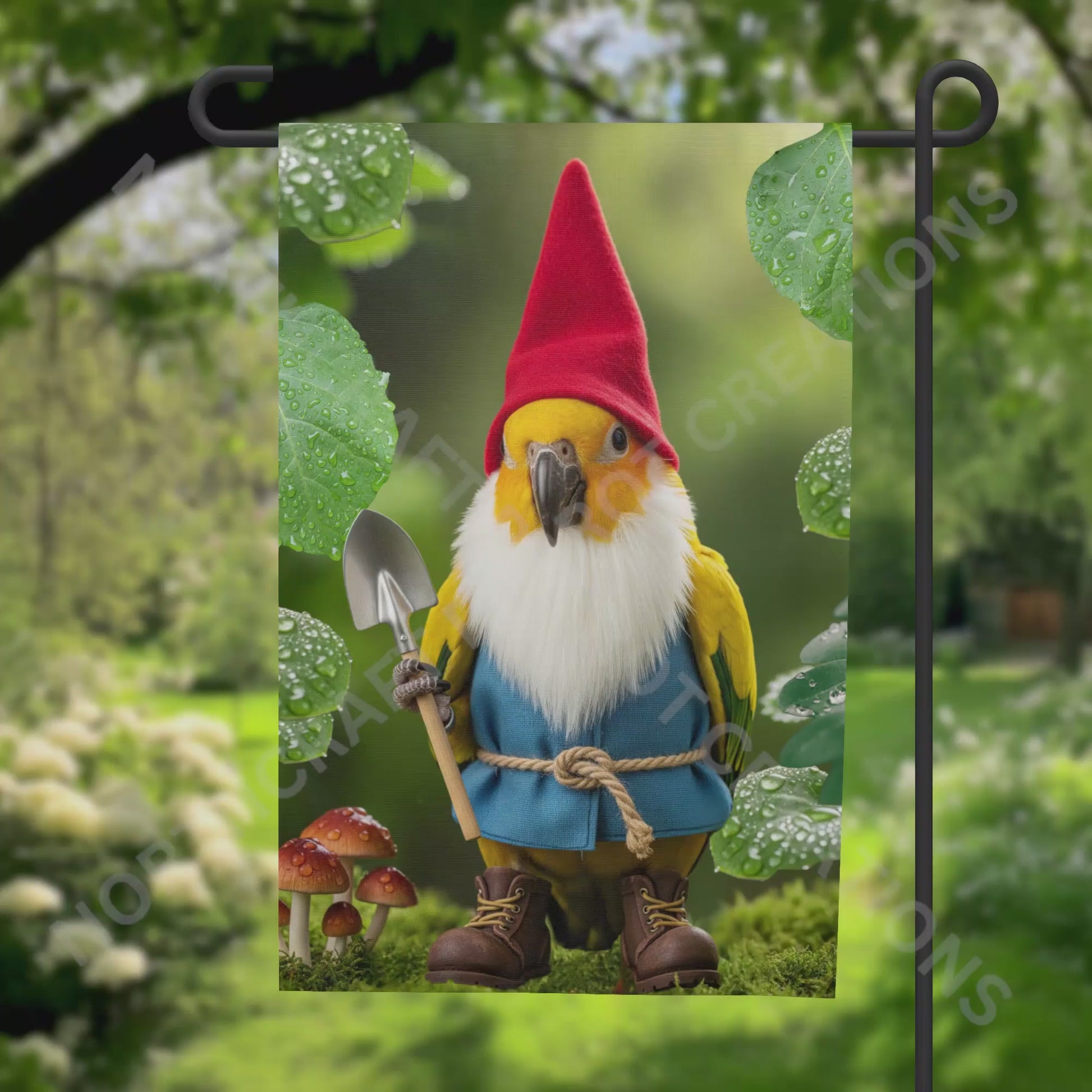 Golden Conure Garden Gnome with Shovel Garden Flag