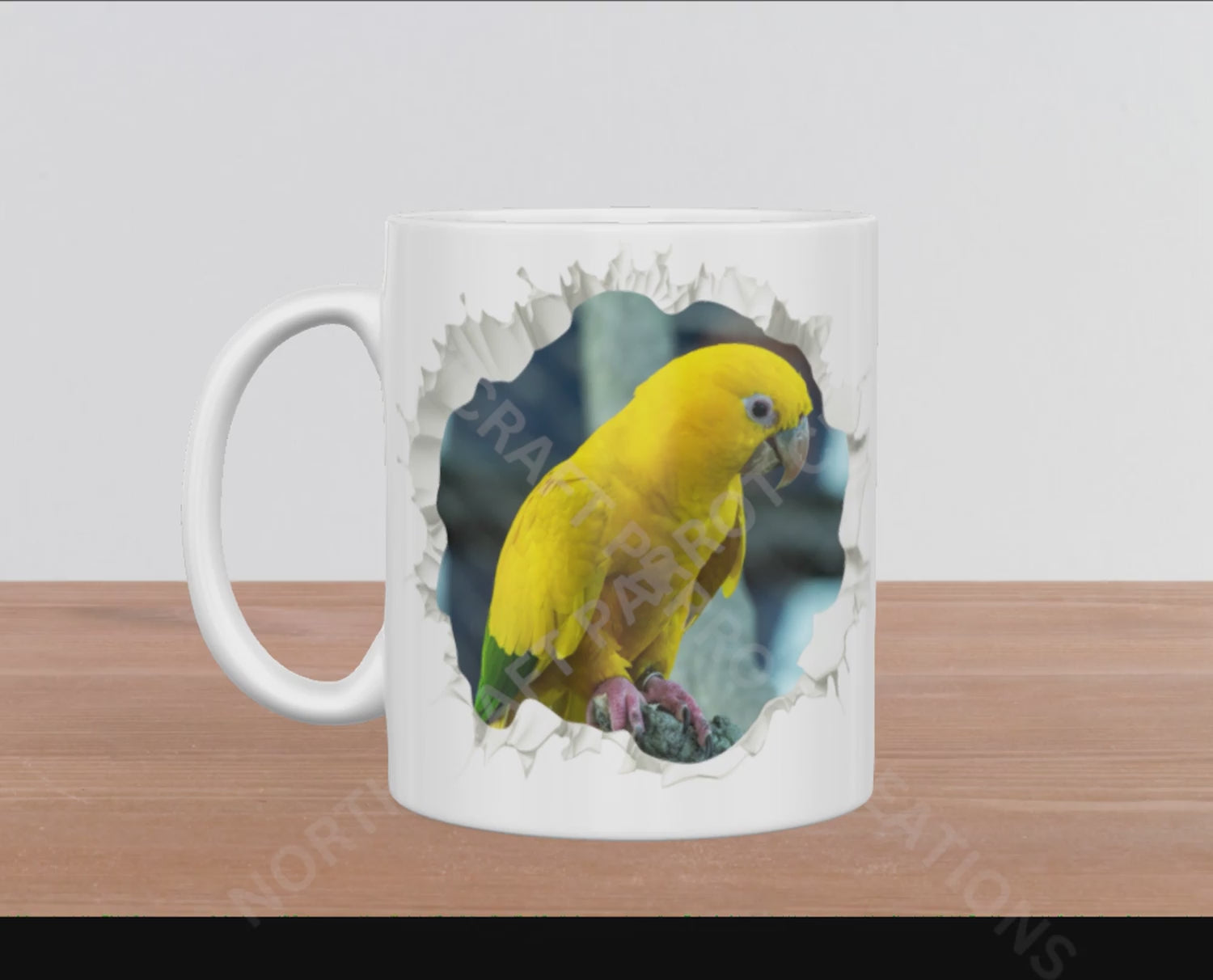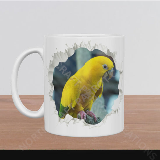 Enjoy your favorite beverage with a touch of whimsy featuring the Golden Conure mug. This unique design creates the illusion that a vibrant Golden Conure is peeking at you through a hole in a wall, adding charm and personality to every sip. Crafted from durable ceramic, its generous 15oz size lets you savor more of your drink while brightening your day with lively, eye-catching art. Perfect for bird lovers and those who appreciate creative, standout mugs.