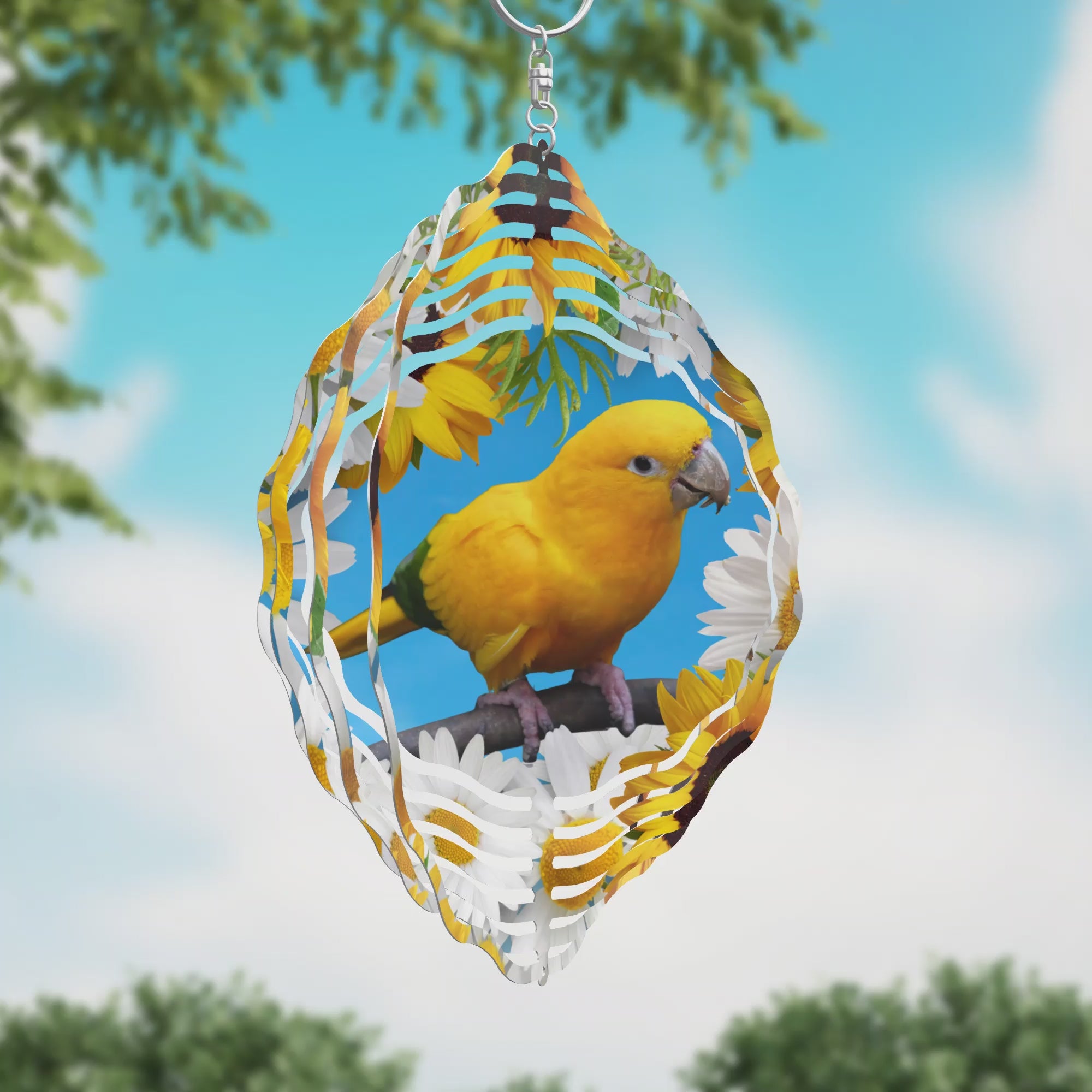 Enhance your outdoor sanctuary with the Golden Conure wind spinner, featuring the elegant Queen of Bavaria Conure nestled among sunflowers and daisies beneath a calm blue sky. Offered in 8" or 10" sizes, this gentle spinner moves softly with the breeze, bringing a peaceful and harmonious touch to your garden or patio.