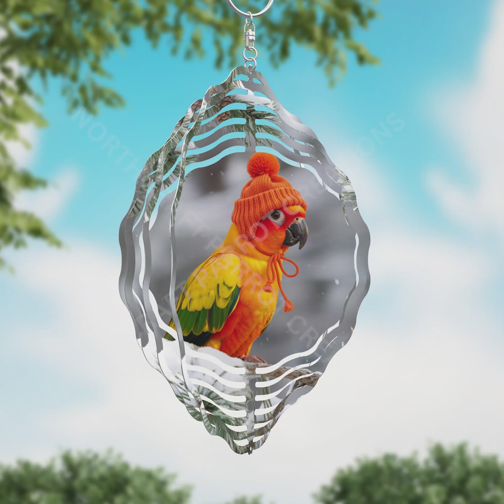 Sun Conure with a Hat on Snowy Branch 8" or 10" Wind Spinner