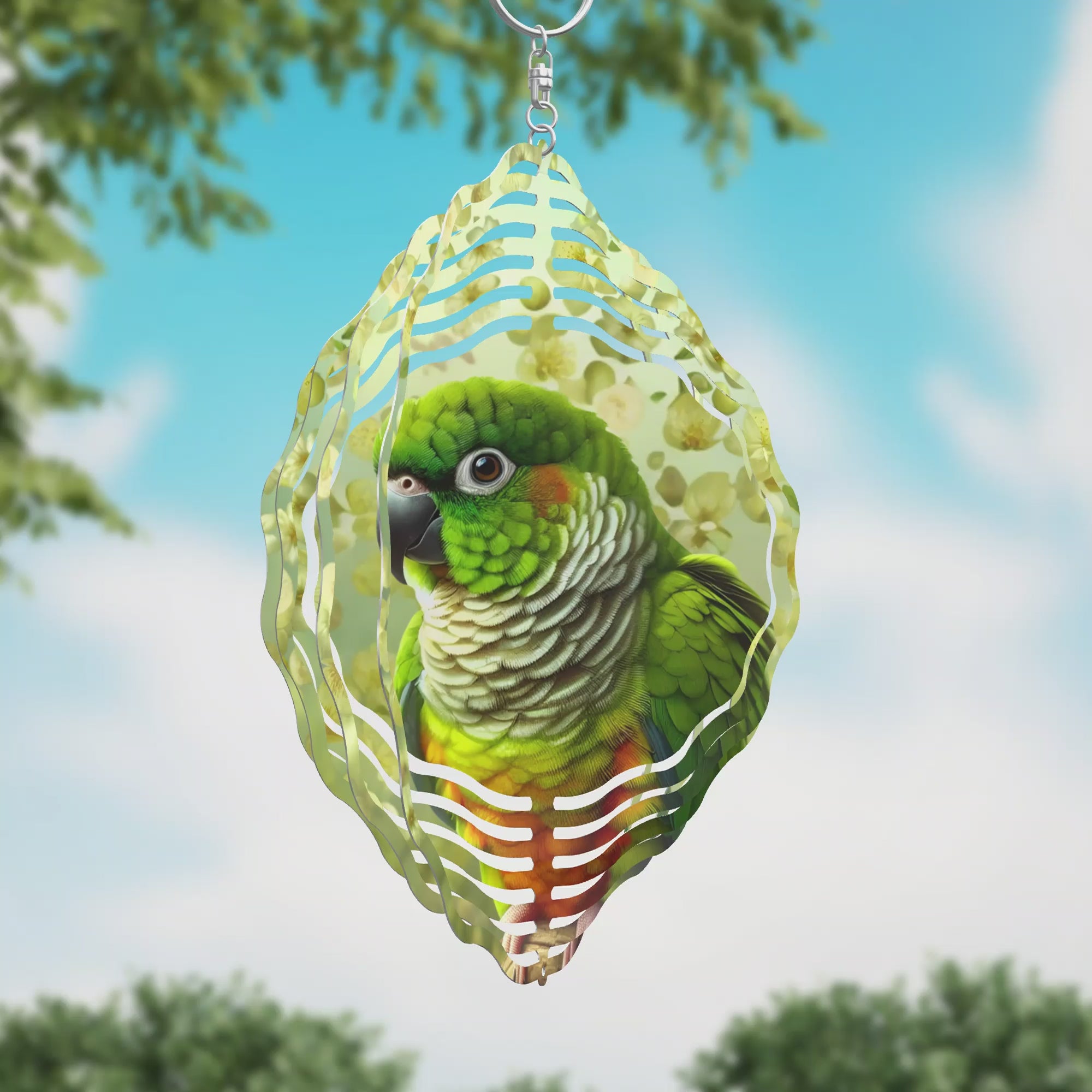 Capture the charm of a lively Green Cheek Conure surrounded by delicate white and yellow blossoms with this elegant 8" or 10" wind spinner. Crafted to add a graceful touch to your outdoor space, its vibrant colors and gentle movement bring both beauty and subtle sophistication to your garden or patio. An exquisite accent that celebrates nature’s playful spirit.