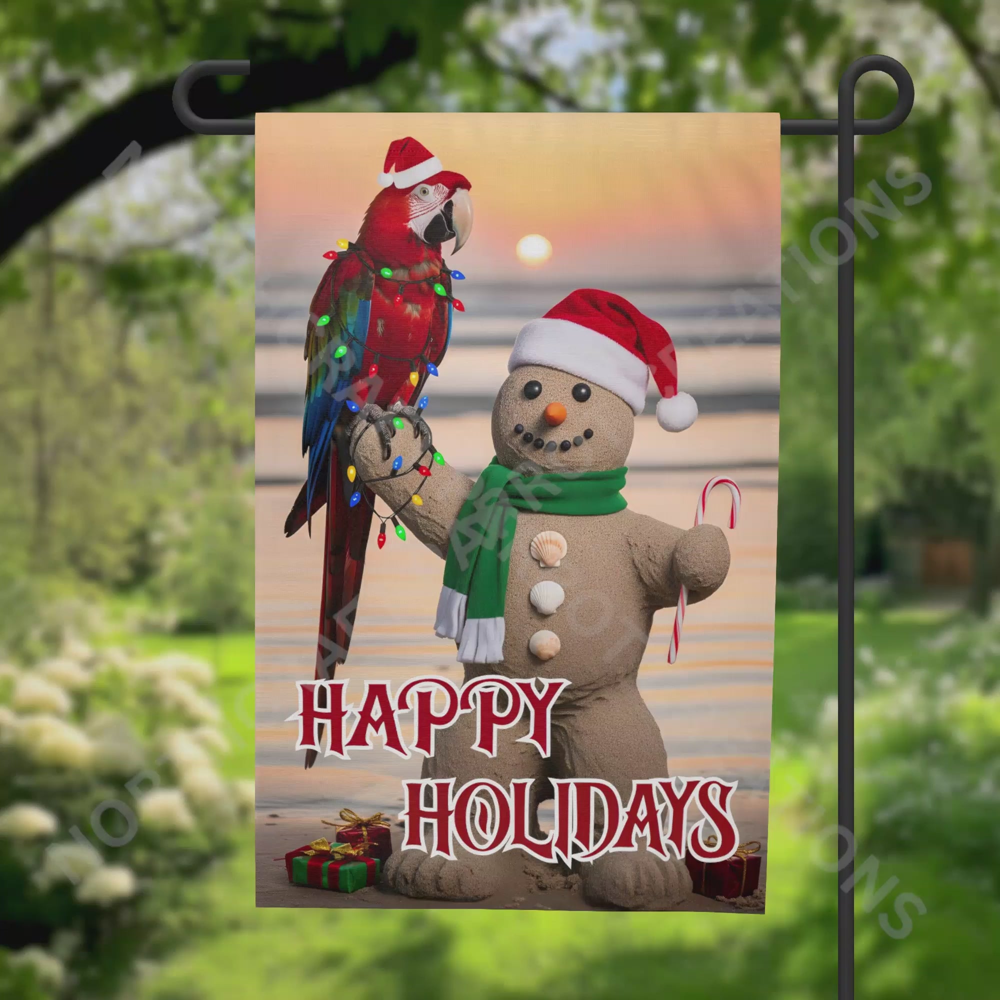 Bring festive cheer to your garden with this playful flag featuring a Green-winged Macaw sporting a Santa hat, perched beside a gingerbread man crafted from sand. Perfect for adding a tropical holiday vibe, this vibrant design brightens outdoor spaces with a joyful twist on seasonal décor.