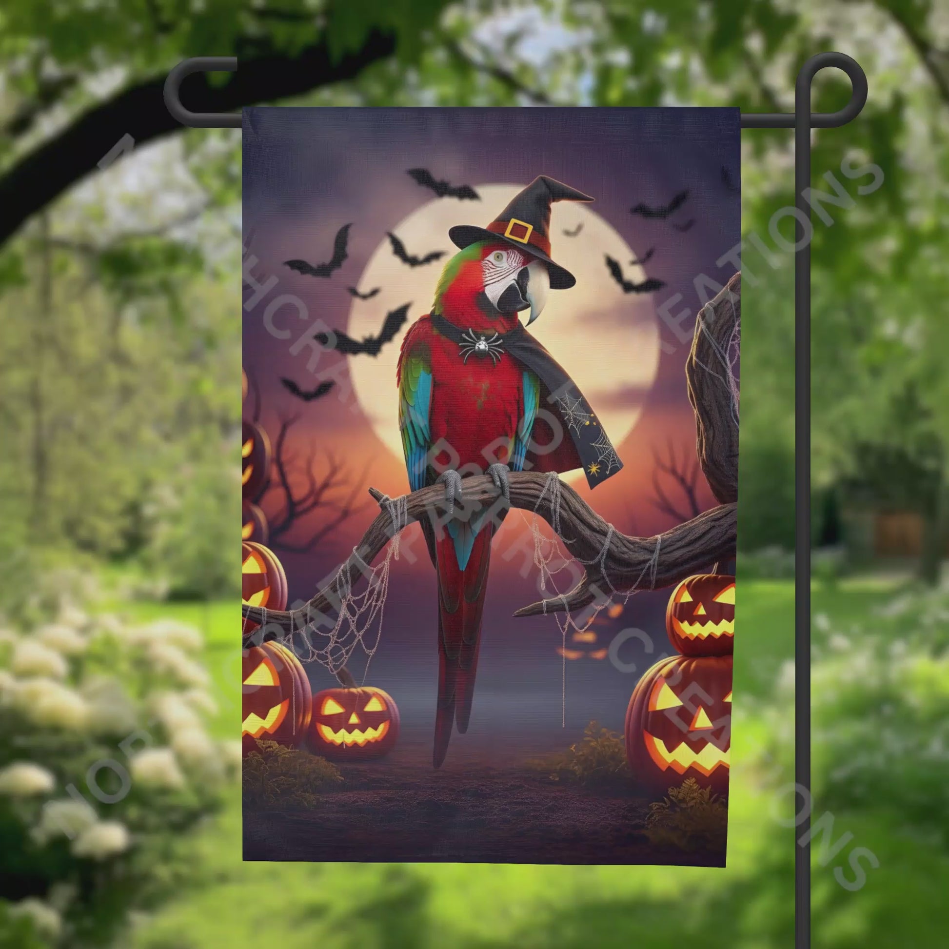 Celebrate Halloween with a unique touch of nature through this Green-Winged Macaw Garden Flag. Featuring a vibrant macaw perched on a branch against a glowing full moon, this flag adds a striking and festive accent to your outdoor décor. Crafted to withstand the elements, it brings color and character to your garden while embracing the spooky spirit of the season. Make your yard stand out with this captivating blend of wildlife and Halloween charm.