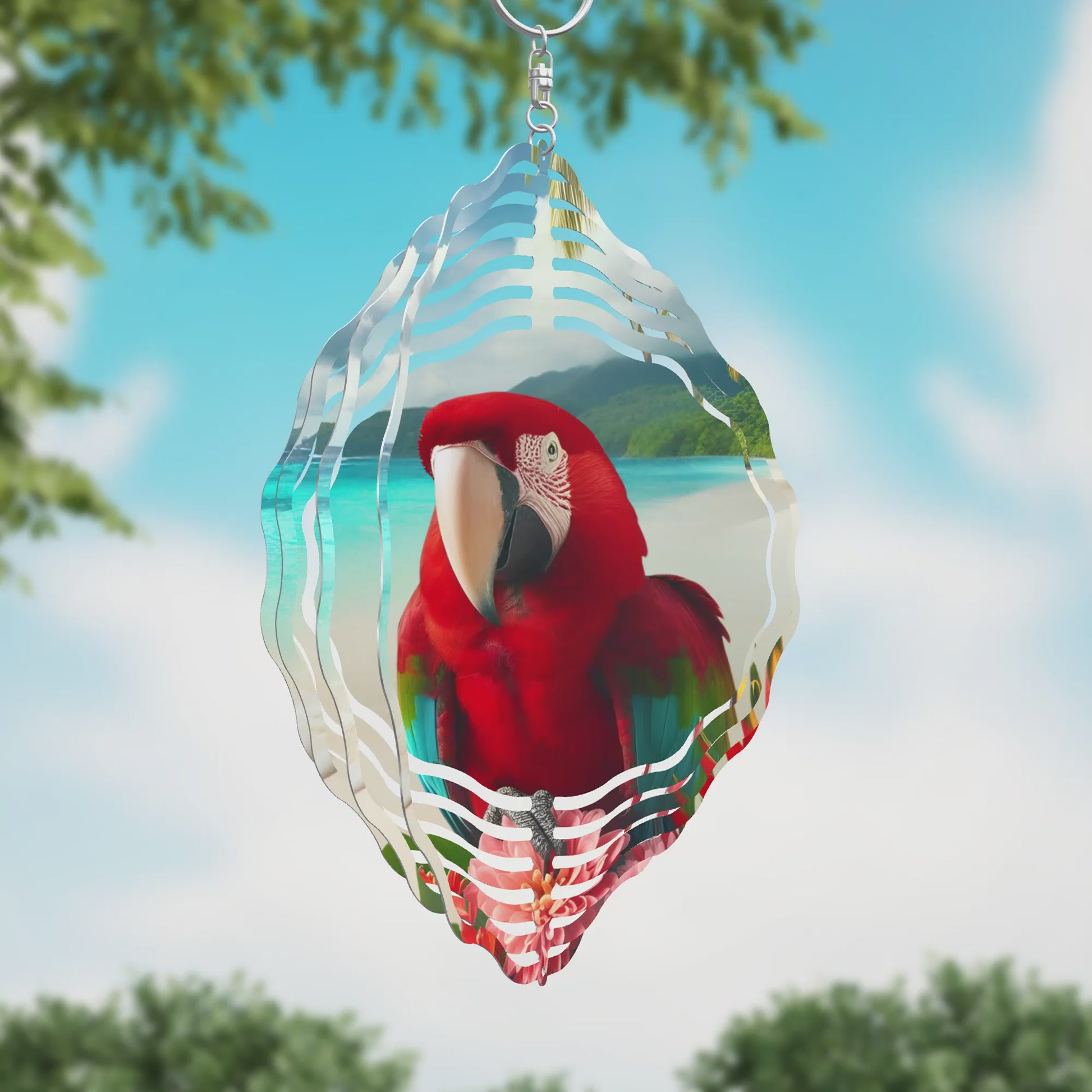 Experience the elegance of the Green-winged Macaw gracefully captured on a wind spinner, set against a serene beach backdrop adorned with vibrant tropical flowers. This exquisite design combines nature's vivid colors with dynamic motion, making it a refined accent for any outdoor space. Perfect for adding a touch of tropical sophistication, it blends artistry with the gentle breeze to bring your surroundings to life.
