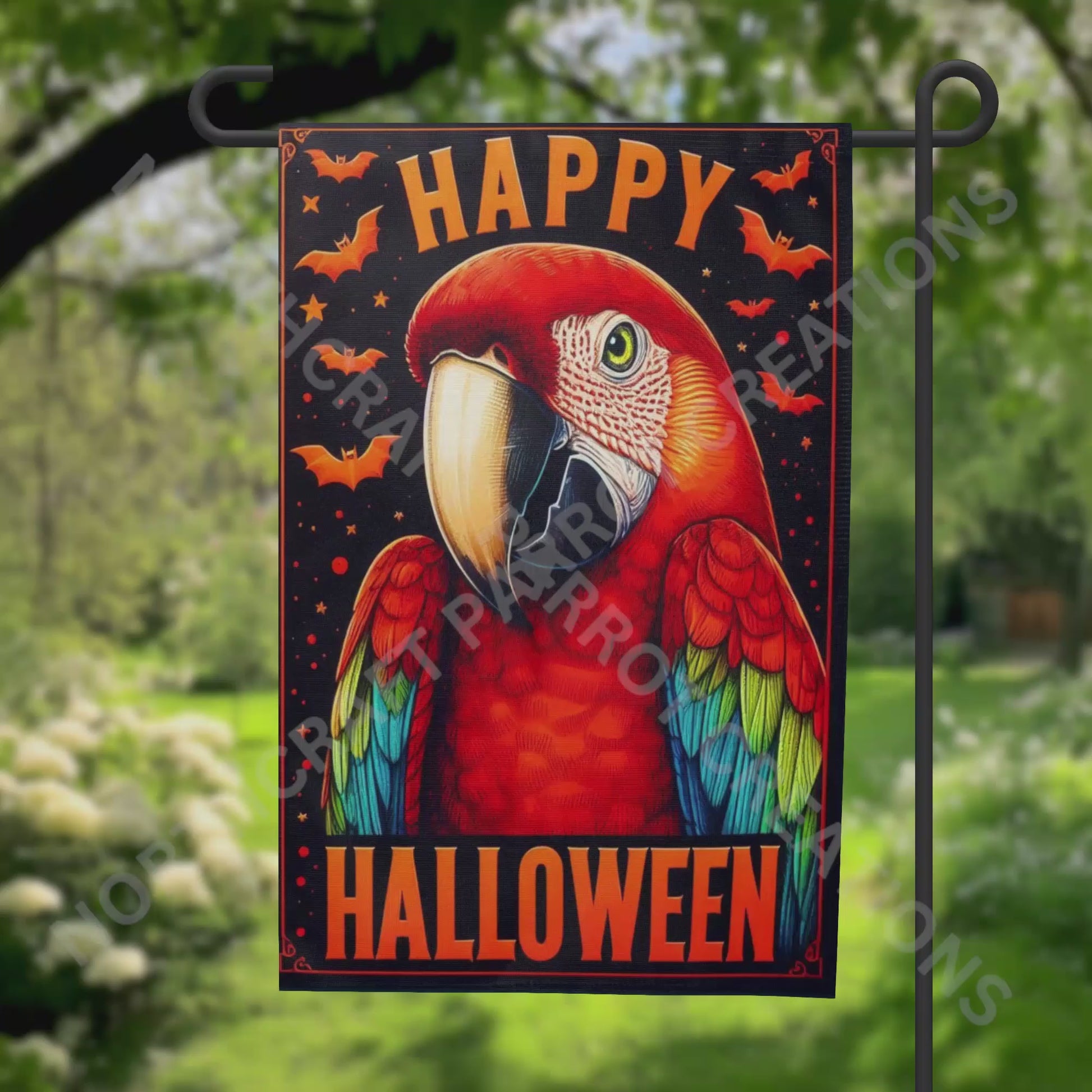 Celebrate Halloween with vivid tropical flair using this garden flag showcasing a colorful Green-Winged Macaw alongside the festive message "Happy Halloween." Crafted for outdoor display, it adds an expert touch of vibrant wildlife charm to your seasonal décor. This flag invites guests to enjoy a unique blend of exotic beauty and holiday spirit in your garden or yard. Image is on both sides. Flag stand is not included.