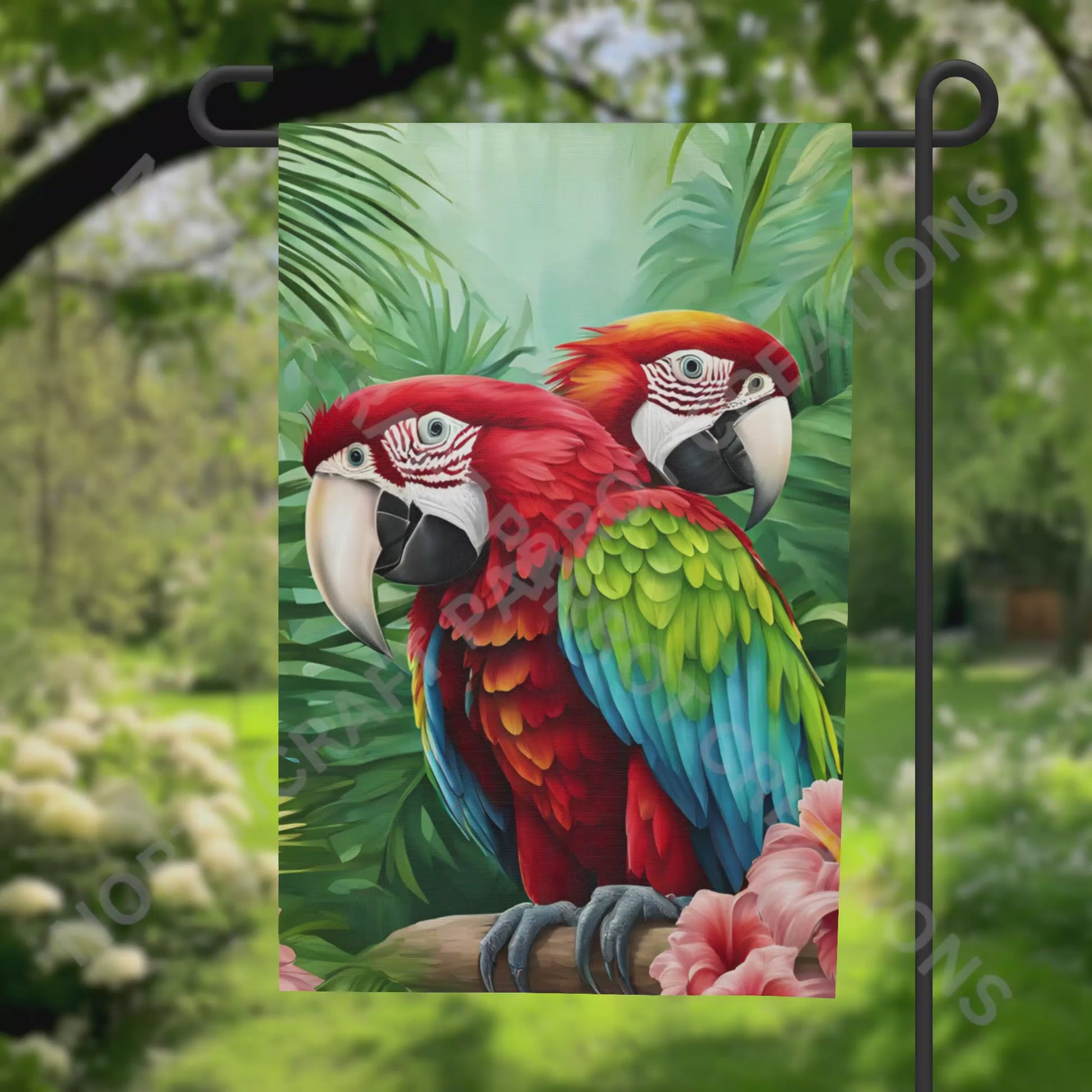 Brighten your outdoor space with a Green-Winged Macaw garden flag. Showcasing vibrant, detailed illustrations of two stunning macaws perched amid delicate ferns, this flag adds a splash of tropical beauty to your garden or patio. It’s the perfect way to welcome guests and celebrate nature’s colorful charm year-round. Image is on both sides. Flag stand is not included.