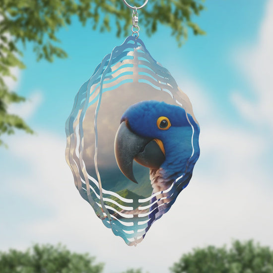 Capture the enchanting allure of the Hyacinth Macaw with this elegant 8" or 10" wind spinner, featuring the bird's signature "always smiling" expression against a serene beach and cloud backdrop. Crafted to gracefully rotate with the breeze, it adds a refined touch of nature’s beauty to any outdoor space. Elevate your décor with this sophisticated spinning tribute to one of the most majestic birds in the world.